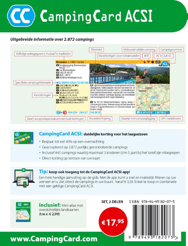 - Nog voordeliger kamperen in het laagseizoen - Bespaar tot wel 60% per nacht - Meer dan 3.000 deelnemende campings, jaarlijks geïnspecteerd - Binnen vier nachten terugverdiend Heel veel kampeervoordeel in het laagseizoen Wie wil er nou niet extra voordelig kamperen in het laagseizoen? Met CampingCard ACSI betaalt u nooit meer te veel voor uw overnachtingen in het voor- en najaar. Op meer dan 3.000 campings in Europa overnacht u dan voor een vast, laag tarief van € 12, € 14, € 16, € 18 of € 20 per nacht*. Heel veel voordeel voor iedere kampeerder die graag buiten het hoogseizoen op vakantie gaat. Zelfs zo voordelig, dat het aankoopbedrag al binnen vier nachten is terugverdiend**. Hoe werkt CampingCard ACSI? CampingCard ACSI is een campinggids inclusief een kortingskaart. De kaart haalt u uit de gids en voorziet u van uw gegevens. Op vertoon van een geldige kortingskaart rekenen deelnemende campings het extra voordelige tarief voor twee personen. Zo eenvoudig is het! Alle meer dan 3.000 deelnemende campings vindt u in de tweedelige CampingCard ACSI-gids. Overzichtelijk weergegeven per land ziet u direct wat u over een camping wilt weten: de ligging, de aanwezige voorzieningen, het overnachtingstarief en de acceptatieperiode van de kortingskaart. Inclusief GPS-coördinaten voor een perfecte navigatie. Standaard meegeleverd bij CampingCard ACSI: - CampingCard ACSI-gids 2021 (tweedelig) - CampingCard ACSI-kortingskaart 2021 - Mini-atlas met alle deelnemende campings - Extra bijlage met de ACSI Klein & Fijn-campings waar u ook met de CampingCard ACSI-kortingskaart terecht kunt *De exacte acceptatiedata verschillen per camping. In de gids leest u in welke periode(s) de camping de CampingCard ACSI-kortingskaart accepteert. **Gebaseerd op de normale overnachtingstarieven in mei, juni en september.
