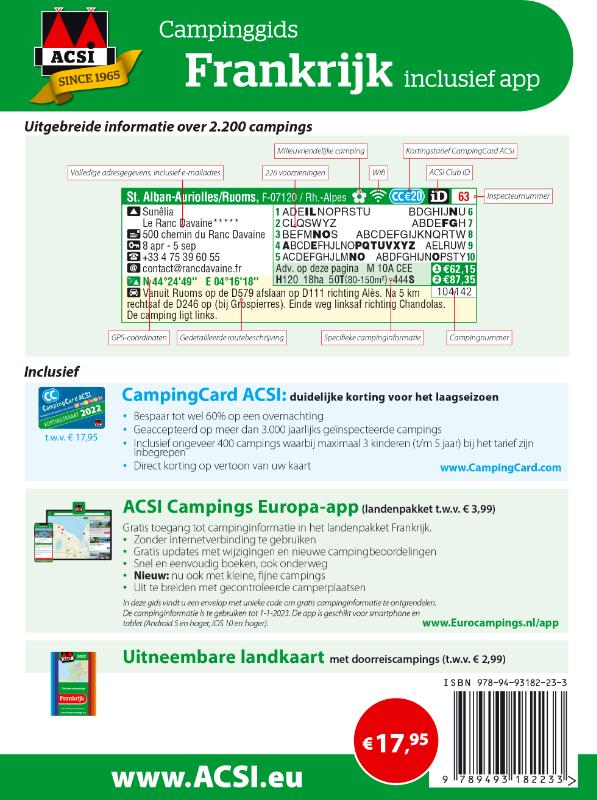 Vind uw ideale camping in Frankrijk! - 2.310 campings in Frankrijk - Alle campings elk jaar door ons geïnspecteerd - Betrouwbare en actuele informatie - Inclusief CampingCard ACSI-kortingskaart voor het laagseizoen - Toegang tot het landenpakket Frankrijk in de handige ACSI Campings Europa-app De ideale camping in Frankrijk: wij kennen hem! Frankrijk blijft voor veel kampeerders vakantieland nummer één. En dat is niet zo vreemd natuurlijk met zoveel variatie. Van de Vogezen en de Champagne-Ardennen in het noorden tot de strakblauwe Côte d'Azur in het zuiden. En van de stranden in Normandië tot de uitgestrekte binnenlanden in de Provence. Wat uw favoriete Franse vakantiebestemming ook is, de beste campings vindt u in de ACSI Campinggids Frankrijk. Hierin vindt u alles over maar liefst 2.310 campings in dit unieke vakantieland. Heel handig tijdens de voorbereiding op uw kampeervakantie en ook ideaal voor onderweg. Alle campings in deze gids worden jaarlijks door onze medewerkers geïnspecteerd op ruim 200 voorzieningen. Dat zorgt voor complete én betrouwbare informatie waarmee u zorgeloos op pad kunt! Zoek en boek met de ACSI Campings Europa-app Bij dit product ontvangt u toegang tot de campinginformatie uit het landenpakket Frankrijk in de handige ACSI Campings Europa-app (t.w.v. € 3,99)*. Hiermee heeft u het complete overzicht van alle Franse campings altijd bij de hand op uw smartphone, tablet of laptop. Dankzij handige filters is een overnachtingsplek heel snel gevonden en op steeds meer campings kunt u via de app direct uw plek reserveren. Door de gratis updates, inclusief wijzigingen en nieuwe campingbeoordelingen, blijft de app altijd actueel. En heeft u de informatie gedownload? Dan kunt u de app ook offline gebruiken. Ideaal voor onderweg! Bij aanschaf van de ACSI Campinggids Frankrijk + app ontvangt u: - ACSI Campinggids Frankrijk 2022 - Kaart met doorreiscampings - CampingCard ACSI-kortingskaart 2022 (t.w.v. € 17,95)** - Toegang tot de campinginformatie uit het landenpakket Frankrijk in de ACSI Campings Europa-app (t.w.v. € 3,99) * Geschikt voor smartphone en tablet (Android 5 en hoger, iOS7 en hoger) en voor laptop en computer (Windows 10). De informatie in de app is tot 1 januari 2023 te raadplegen. **Met de CampingCard ACSI-kortingskaart overnacht u in het laagseizoen tegen een vast en voordelig tarief (€ 12, € 14, € 16, € 18 € 20, of € 22 per nacht) op meer dan 3.000 campings in Europa. U hoeft hiervoor enkel uw gegevens in te vullen op de kortingskaart en deze te tonen bij de receptie van de camping. In de ACSI Campinggids Europa wordt middels een symbooltje aangegeven welke campings de CampingCard ACSI-kortingskaart accepteren. Voor meer informatie over CampingCard ACSI en voor de exacte acceptatiedata per camping kunt u kijken op CampingCard.com.