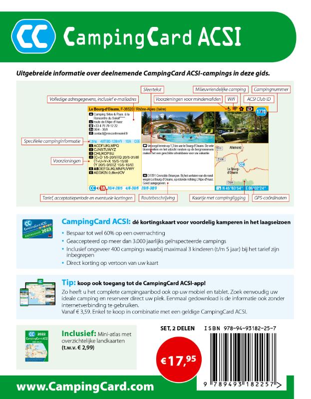 - Nog voordeliger kamperen in het laagseizoen - Bespaar tot wel 60% per nacht - Meer dan 3.000 deelnemende campings, jaarlijks geïnspecteerd - Binnen vier nachten terugverdiend Heel veel kampeervoordeel in het laagseizoen Wie wil er nou niet extra voordelig kamperen in het laagseizoen? Met CampingCard ACSI betaalt u nooit meer te veel voor uw overnachtingen in het voor- en najaar. Op meer dan 3.000 campings in Europa overnacht u dan voor een vast, laag tarief van € 12, € 14, € 16, € 18, € 20 of € 22 per nacht*. Heel veel voordeel voor iedere kampeerder die graag buiten het hoogseizoen op vakantie gaat. Zelfs zo voordelig, dat het aankoopbedrag al binnen vier nachten is terugverdiend**. Hoe werkt CampingCard ACSI? CampingCard ACSI is een campinggids inclusief een kortingskaart. De kaart haalt u uit de gids en voorziet u van uw gegevens. Op vertoon van een geldige kortingskaart rekenen deelnemende campings het extra voordelige tarief voor twee personen. Zo eenvoudig is het! Alle meer dan 3.000 deelnemende campings vindt u in de tweedelige CampingCard ACSI-gids. Overzichtelijk weergegeven per land ziet u direct wat u over een camping wilt weten: de ligging, de aanwezige voorzieningen, het overnachtingstarief en de acceptatieperiode van de kortingskaart. Inclusief GPS-coördinaten voor een perfecte navigatie. Standaard meegeleverd bij CampingCard ACSI: - CampingCard ACSI-gids (tweedelig) - CampingCard ACSI-kortingskaart - Mini-atlas met alle deelnemende campings - Extra bijlage met de ACSI Klein & Fijn-campings waar u ook met de CampingCard ACSI-kortingskaart terecht kunt *De exacte acceptatiedata verschillen per camping. In de gids leest u in welke periode(s) de camping de CampingCard ACSI-kortingskaart accepteert. **Gebaseerd op de normale overnachtingstarieven in mei, juni en september.Reviews