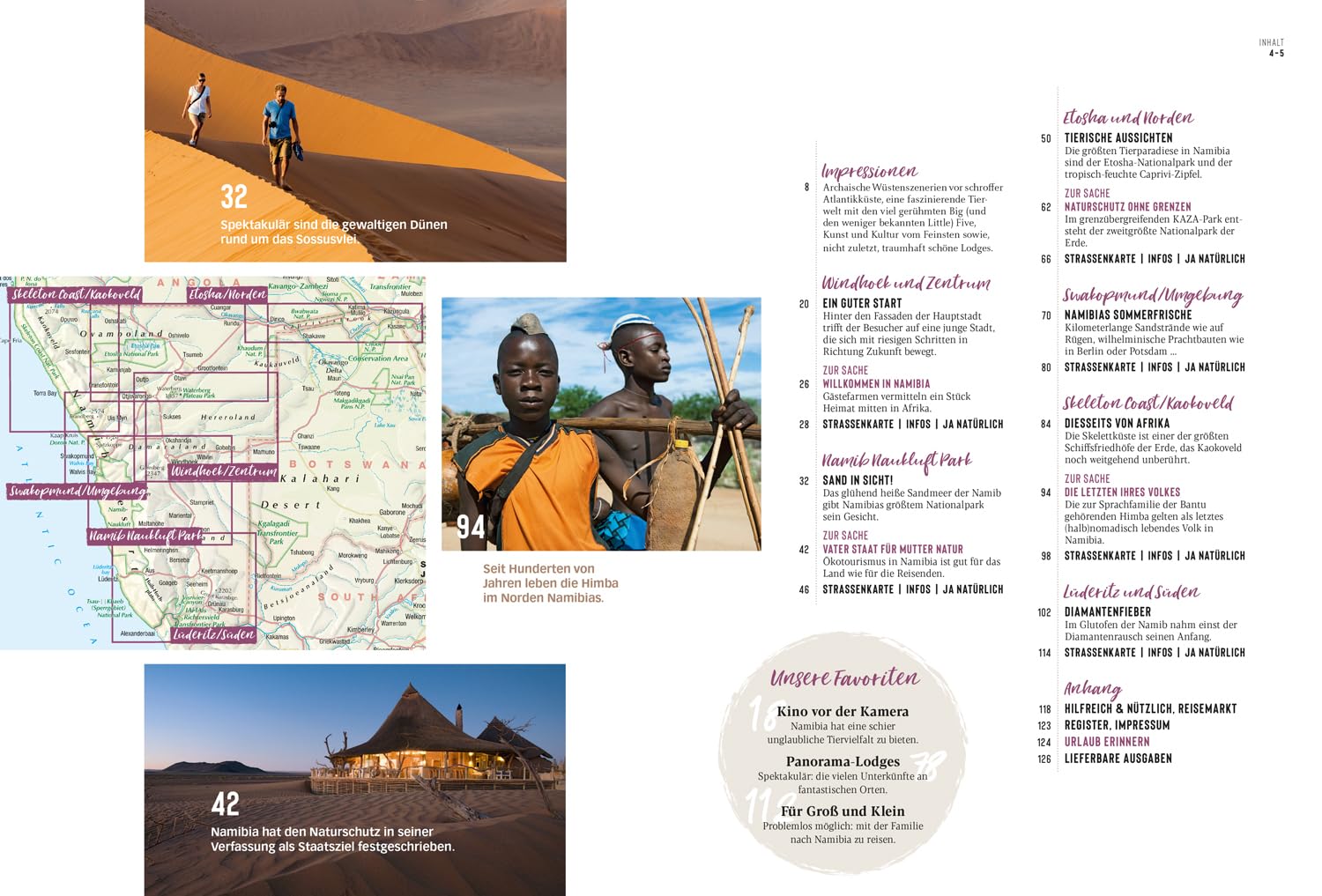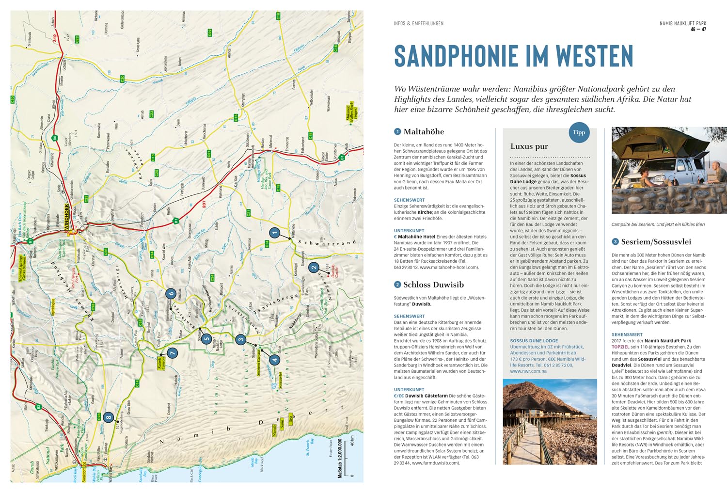 DuMont Bildatlas Namibia - auf die Besucher warten Wüstenszenerien vor der schroffen Atlantikküste, eine faszinierende Tierwelt mit den viel gerühmten Big Five, Kunst und Kultur vom Feinsten sowie deutsche Gastfreundschaft inklusive. Unser Fotograf Tom Schulze war mehrere Monate unterwegs und lieferte faszinierende Tier- und Naturaufnahme ebenso wie Impressionen aus dem Alltag der Menschen. Die Texte dazu liefert Fabian von Poser, der Sie kenntnisreich und kritisch durch die sechs Kapitel begleitet und einen Überblick über die Sehenswürdigkeiten gibt, die dieses Land zu bieten hat. Dabei greift er aktuelle und interessante Themen auf, die als Hintergrundreportagen und Specials Besonderheiten des Landes beinhalten und unterhaltsam zu lesen sind: lassen Sie sich nach Purros entführen, wo sich das Himba-Volk den nomadischen Lebensstil bewahrt hat, lesen Sie über den KAZA-Park, der in einigen Jahren der größte Nationalpark der Erde sein soll oder über eine Trekkingtour auf Pferd oder Muli durch den Fish River Canyon. Im Anschluss an jedes Kapitel finden Sie Infoseiten mit allen wichtigen Sehenswürdigkeiten, die auf der nebenstehenden detaillierten Reisekarte leicht zu lokalisieren sind. Abgerundet wird der Bildatlas durch das abschließende Servicekapitel, das praktische und allgemeine Informationen zum Alltag und für die Vorbereitung der Reise beinhaltet. Kompakt zusammengefasst und übersichtlich überzeugt der DUMONT Bildatlas als zuverlässiger Reisebegleiter und garantiert erlebnisreiche Tage in Namibia!a