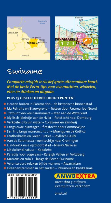 Voor Nederlanders blijft Suriname een comfortabele mix tussen exotisch en vertrouwd. Of je nu diep in de jungle zit, aan de boorden van de Atlantische Oceaan, of in het hart van Paramaribo. De ANWB Extra reisgids Suriname biedt naast veel praktische tips over vakantiehuizen, hotels en vervoer ook 15 inspirerende bezienswaardigheden die je niet mag missen. Ga fietsen langs de oude plantages van Crommewijne, duik in het koele water van de Colakreek, of maak een trip naar het landelijke plaatsje Groningen aan de rivier Saramacca.