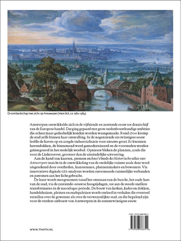 Antwerpen ontwikkelde zich in de vijftiende en zestiende eeuw tot draaischijf van de Europese handel. Dat ging gepaard met grote stedenbouwkundige ambities die echter maar gedeeltelijk konden worden waargemaakt. Rond 1700 kromp de stad zelfs binnen haar omwalling. In de negentiende en twintigste eeuw leefde de haven op en zorgde industrialisatie voor nieuwe groei. Er kwamen nieuwe havendokken, de binnenstad werd gemoderniseerd en de voorsteden werden geïntegreerd in het stedelijke weefsel. Opnieuw bleken de plannen, zoals die voor de Linkeroever, grootser dan de eigenlijke uitvoering. Aan de hand van kaarten, prenten en foto’s biedt de Historische Atlas van Antwerpen inzicht in de ontwikkeling van de stedelijke ruimte zoals deze werd uitgetekend door overheden, kunstenaars, plannenmakers en bewoners. Via innovatieve digitale GIS-analyses worden onvermoede ruimtelijk verbanden en patronen aan het licht gebracht. De lezer wordt meegenomen vanaf het ontstaan van de burcht, het oude hart van de stad, via de zestiende-eeuwse hoogtijdagen, wordt de lezer meegenomen tot aan de steeds snellere transformaties in de naoorlogse periode. De bouw van kerken, kades en dokken, handelshuizen, pleinen en stadspaleizen, wordt ontleed in verhalen die evenveel vertellen over de gewenste als over de verwezenlijkte stad, en die bepalend zijn voor de verdere uitbouw van Antwerpen in de eenentwintigste eeuw.