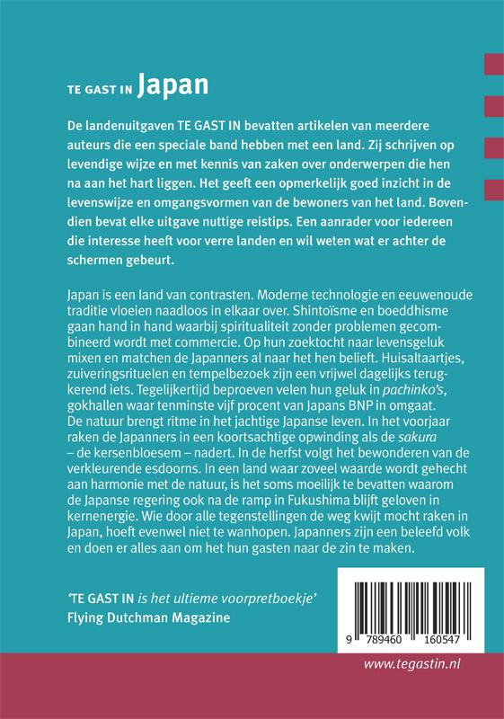 TE GAST IN Japan (pocket), 2de geheel vernieuwde druk, is samengesteld door en voor reizigers met verhalen van auteurs die er gewoond, gewerkt of gereisd hebben. Met veel insiders informatie over land en bevolking. Om je bezoek nog beter voor te bereiden en je in te leven in de cultuur van de lokale bevolking, is de pocketreeks TE GAST IN ideaal. Een handzaam en compact boekje met vlot leesbare artikelen die handige tips bevatten voor je reis naar Japan. In deze editie aandacht voor de tegenstellingen in Japan, enerzijds hightech en effiency, anderzijds bijgeloof en gokverslaving. Veel aandacht ook voor het shintoïsme, de 'oerreligie' van Japan, die er toe bijdraagt dat de Japanners zich zo verbonden voelen met de natuur. Ook de populariteit van het baden komt voort uit het shinto-geloof waarbij reiniging belangrijk is. Daarnaast aandacht voor de Japanse keuken die erg smaakvol wordt opgediend. Verder een opmerkelijk verhaal over Japanners en hun liefde voor dieren. En wat leren Japanners van rampen zoals de atoombom op Hiroshima en vrij recentelijk de tsunami in Fukushima? Een verslag over de oude postroute van Kyoto naar Tokio en brengt je in de sfeer van samoerai krijgers. Het boekje sluit af met een wandeling door Tokio waarbij twee locals je wegwijs maken in deze miljoenenstad. De rubriek 'reisinformatie' helpt je verder met tips voor de meest voorkomende noden. En voor wie zich verder wil oriënteren is er lijstje met boeken- en filmtips. Deze pocket is er niet alleen voor reizigers die Japan willen bezoeken. Iedereen die interesse heeft in dit land en in korte tijd een goede indruk van het land wil krijgen, zal met deze TE GAST IN een schat aan informatie ervaren.Reviews