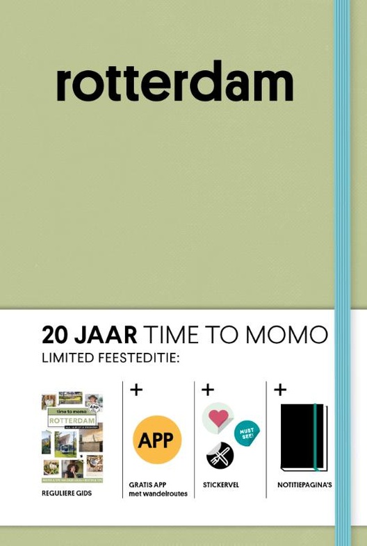 De time to momo gidsen bestaan 20 jaar en dat vieren wij! Onze acht meest populaire bestemmingen hebben we geüpgraded tot een luxe feesteditie met veel extra’s: een stickervel om favoriete hotspots of je hotel te markeren op de kaart; notitiepagina’s om je eigen point of interests toe te voegen, je uitgaven bij te houden, wat te schetsen of te schrijven; een handig en vrolijk elastiek, en last but not least: een linnen look flexibound omslag. En de vertrouwde gids plus routekaarten en stadsplattegrond zitten er natuurlijk ook in. Acht pareltjes om allemaal te hebben! Luxe limited editie Met stickervel Met 16 notitiepagina’s Met time to momo Rotterdam haal je alles uit je stedentrip! En deze nieuwe editie heeft een volledige corona-update ondergaan. Plus een gloednieuw omslag en duidelijker kaarten binnenin. Stap je hotel uit en loop regelrecht naar de leukste wijken van de stad. Op weg naar nieuwe restaurantjes, de beste koffie en dat lokaal gebrouwen biertje. Bij time to momo delen lokale auteurs uit liefde voor hún stad alleen de echte highlights met je. Zo sla je de drukke dertien-in-een-dozijn-winkelstraten over en wandel je, terwijl je onderweg een bezienswaardigheid meepikt, naar de leukste adressen waar de locals zelf graag komen. Met 4 verrassende routes door de verschillende wijken van Rotterdam kun je deze stad in je eigen tempo ontdekken én de lokale lifestyle beleven. Inclusief: - Alle belangrijke bezienswaardigheden - Meer dan 250 adressen om te eten, drinken en shoppen - Handige uitneembare stadsplattegrond én gratis kaart-app - Leuke top 10-lijstjes Nu met gratis app!! time to momo is met meer dan 200.000 verkochte gidsen per jaar de bestverkochte stedengids van Nederland en België. We zijn al meer dan 20 jaar een inspiratiebron voor reizigers. Check al onze stedentripbestemmingen, de laatste nieuwe tips en hotelinspiratie op www.timetomomo.com