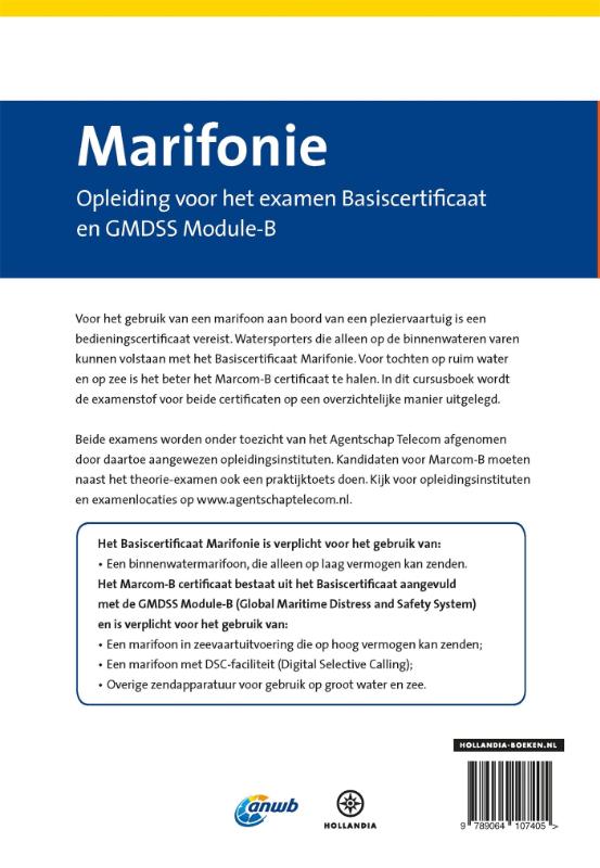 Bereid je voor op het behalen van je marifooncertificaat met het 'ANWB Cursusboek Marifonie'. Met een marifoon kun je met andere schepen en walstations communiceren, zowel op zee als op de binnenwateren. Goed marifoongebruik is essentieel voor een vlotte en veilige vaart. En zeker voor de Nederlandse vaarwegen, die tot de drukste ter wereld behoren. Voor het gebruik van een marifoon is een bedieningscertificaat nodig: dat bestaat uit het Basiscertificaat voor het gebruik van een binnenvaartmarifoon en het Beperkt Certificaat (Marcom-B) voor het gebruik van een marifoon in zeevaartuitvoering. Dit cursusboek bevat de examenstof voor beide certificaten. Met het 'ANWB Cursusboek Marifonie' ben je uitstekend voorbereid op je examens en behaal je binnen een mum van tijd je marifooncertificaten.