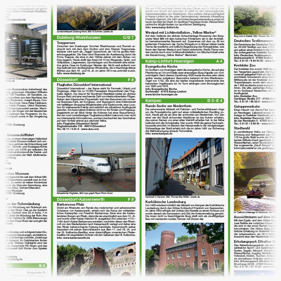 Aan de Niederrhein ligt Duisburg, niet alleen de grootste binnenhaven van Europa, de luchthaven Düsseldorf en de alomtegenwoordige sporen van de Romeinen, maar ook tal van andere attracties en een groot aantal verschillende musea kunnen fietsers en wandelaars aan doen. Voor elke smaak, groot of klein, is er iets te vinden langs de lange afstand en regionale routes: van het Niederrheinisches Freilichtmuseum, industriële monumenten of de Barbarossa-Pfalz in Kaiserswerth tot het Duitse textielmuseum en de renbaan in Krefeld. Vooral 's avonds een bezoek waard aan de lichtinstallatie "Yellow Marker" in Kamp-Lintfort.Reviews