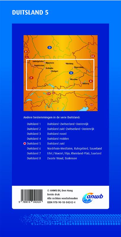 ANWB Wegenkaart Duitsland zuid Met de gedetailleerde en nauwkeurige ANWB Wegenkaart Duitsland 5: Duitsland zuid op schaal 1:300.000 (1 cm = 3 km), ga je goed voorbereid op autovakantie. De kaart bevat een uitgebreid plaats- en straatnamenregister en stadsplattegronden van Augsburg, Fürth, Karslruhe, Ludwigshafen/Mannheim, München, Nürnberg, Regensburg, Saarbrücken, Salzburg en Stuttgart. In de legenda vind je uitgebreide toeristische informatie. De compacte wegenkaart is gemaakt van een stevig, duurzaam materiaal, waardoor hij veelvuldig kan worden in- en uitgevouwen. De ANWB Wegenkaart is al jaren de best verkochte wegenkaart in Nederland. Met meer dan 65 kaarten is er een kaart voor bijna elke bestemming.Reviews
