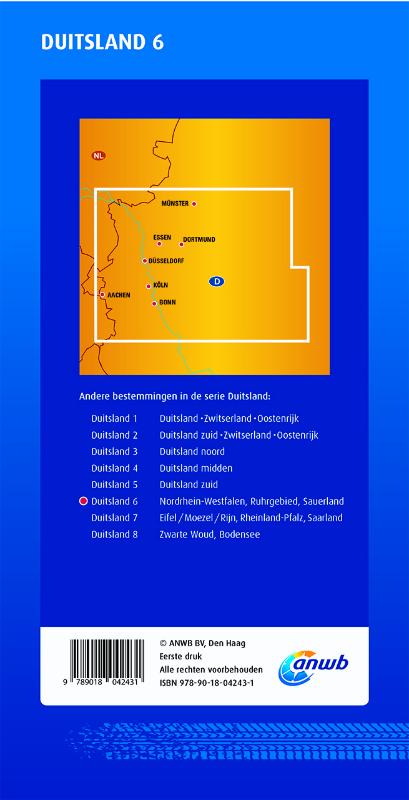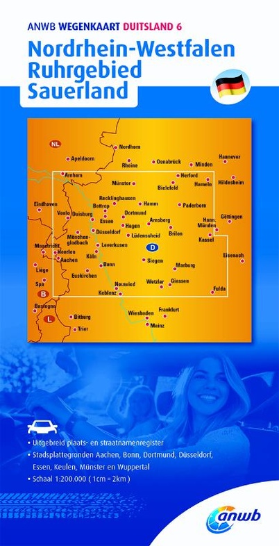 ANWB Wegenkaart Nordrhein-Westfalen, Ruhrgebied, Sauerland Met de gedetailleerde en nauwkeurige ANWB Wegenkaart Duitsland 6: Nordrhein-Westfalen, Ruhrgebied, Sauerland op schaal 1:200.000 (1 cm = 2 km), ga je goed voorbereid op autovakantie. De kaart bevat een uitgebreid plaats- en straatnamenregister en stadsplattegronden van Aachen, Bonn, Dortmund, Düsseldorf, Essen, Keulen, Münster en Wuppertal. In de legenda vind je uitgebreide toeristische informatie. De compacte wegenkaart is gemaakt van een stevig, duurzaam materiaal, waardoor hij veelvuldig kan worden in- en uitgevouwen. De ANWB Wegenkaart is al jaren de best verkochte wegenkaart in Nederland. Met meer dan 65 kaarten is er een kaart voor bijna elke bestemming.Reviews