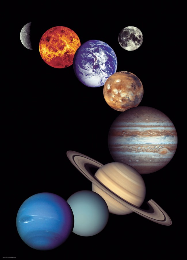Hele moeilijke puzzel van ons zonnestelsel. Wat een uitdaging is deze: veel zwart en kleuren van de planeten.