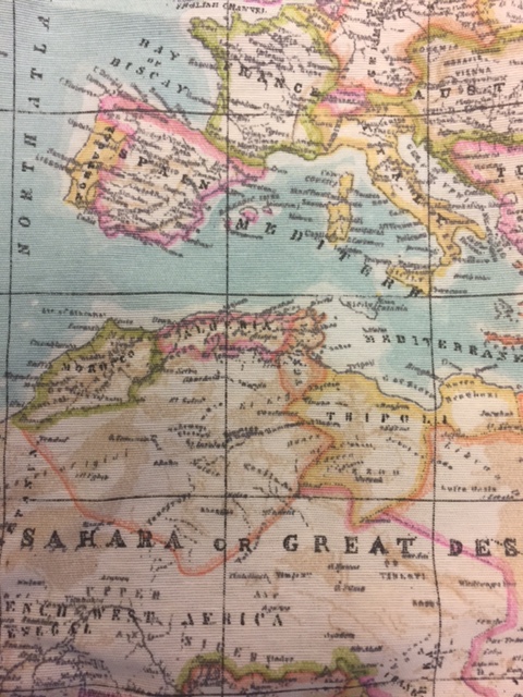 Mooie linnen tas met lange hengsels, met een print van een wereldkaart. Afmeting ca. 40 x 30 cm.