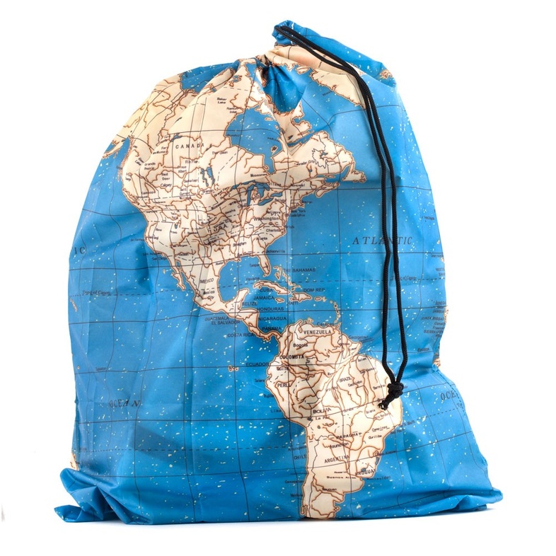 Reis nu in stijl met deze set van vier handige reiszakjes bedrukt met een mooie wereldkaart. Een grote waszak (56 x 41 cm) voor je vuile was, twee kleinere zakken (38 x 20 cm) om schoenen in te bewaren en een zak (36 x 29 cm) om losse persoonlijke bezittingen in op te bergen. Als de zakken niet in gebruik zijn kun je ze heel klein opvouwen, zodat ze amper ruimte innemen.