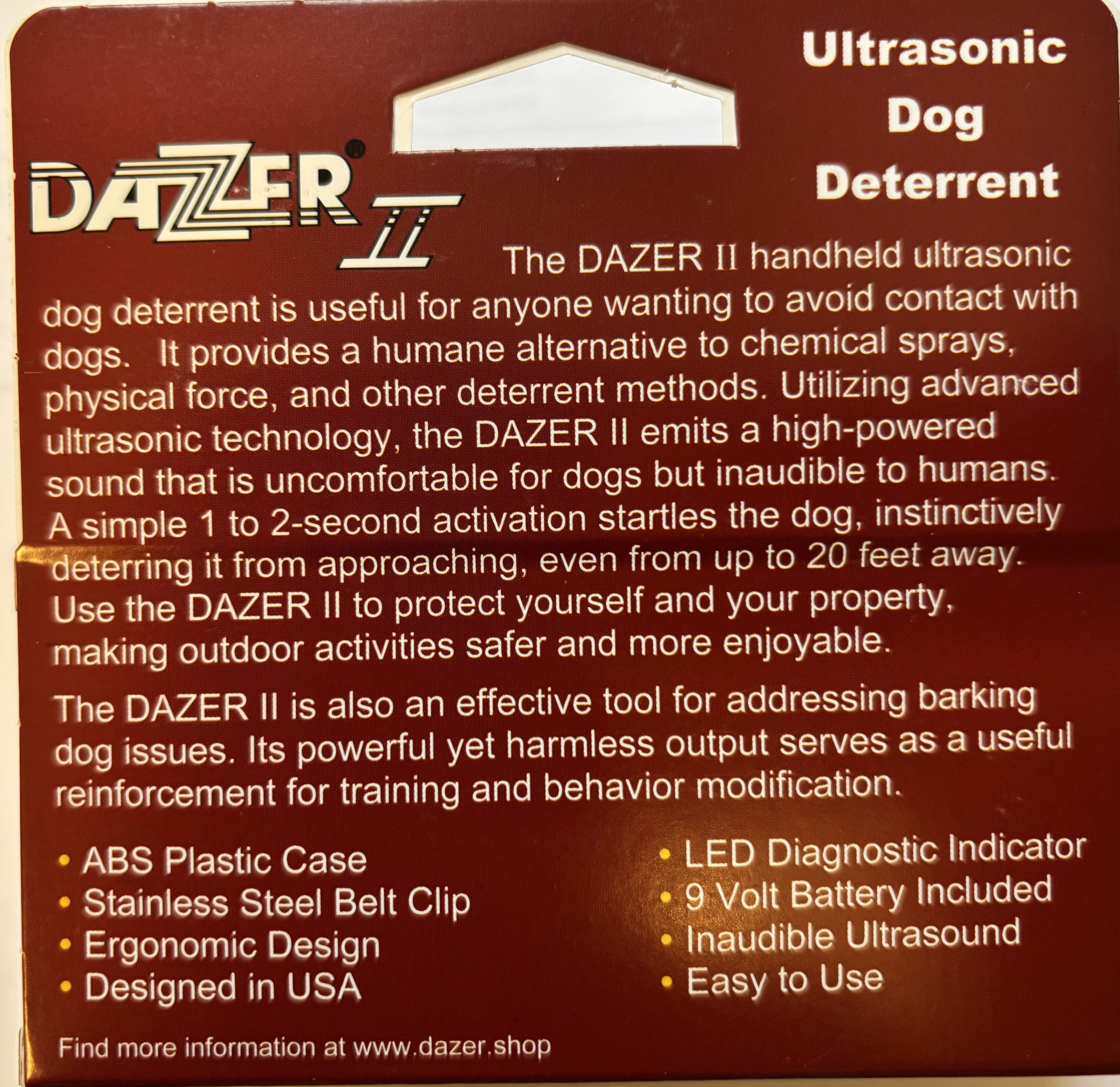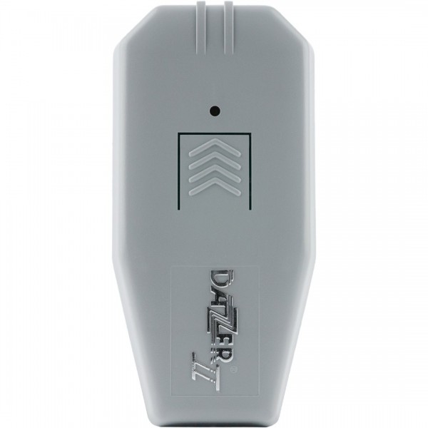 Het zendertje van de Dazer werkt op een vervangbare 9 volt alkaline batterij. Deze is goed voor ruim 1000 keer een signaal ofwel 3 à 4 jaar gebruik. Vaak nog langer. De Dazer zelf gaat veel langer mee. De Dazer is made in de USA en weegt slechts 120 gram inclusief batterij en bevestigingsclip en is 11 cm lang, 6cm breed en 3 cm dik.