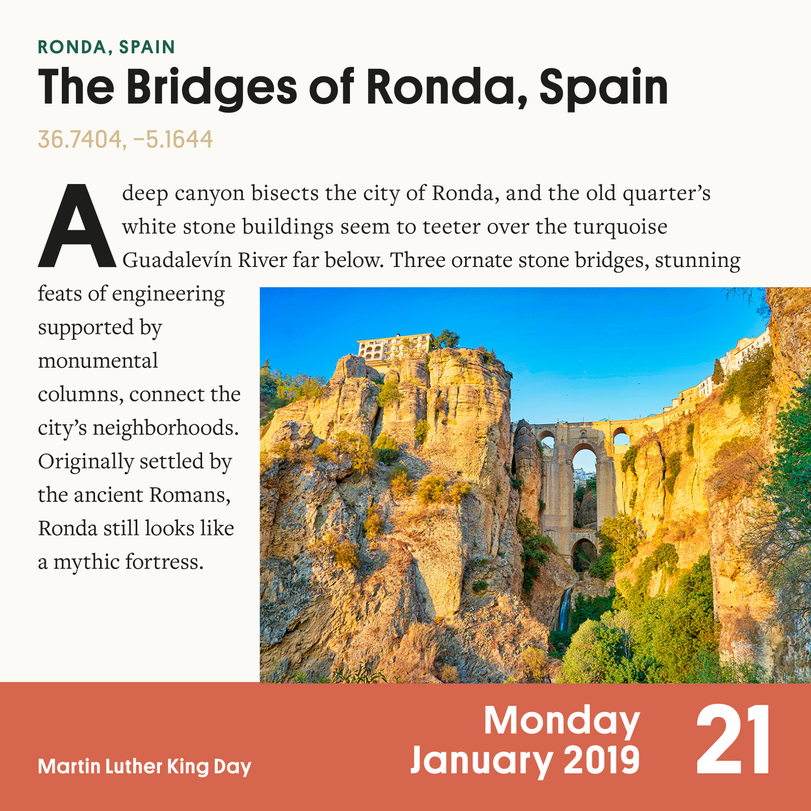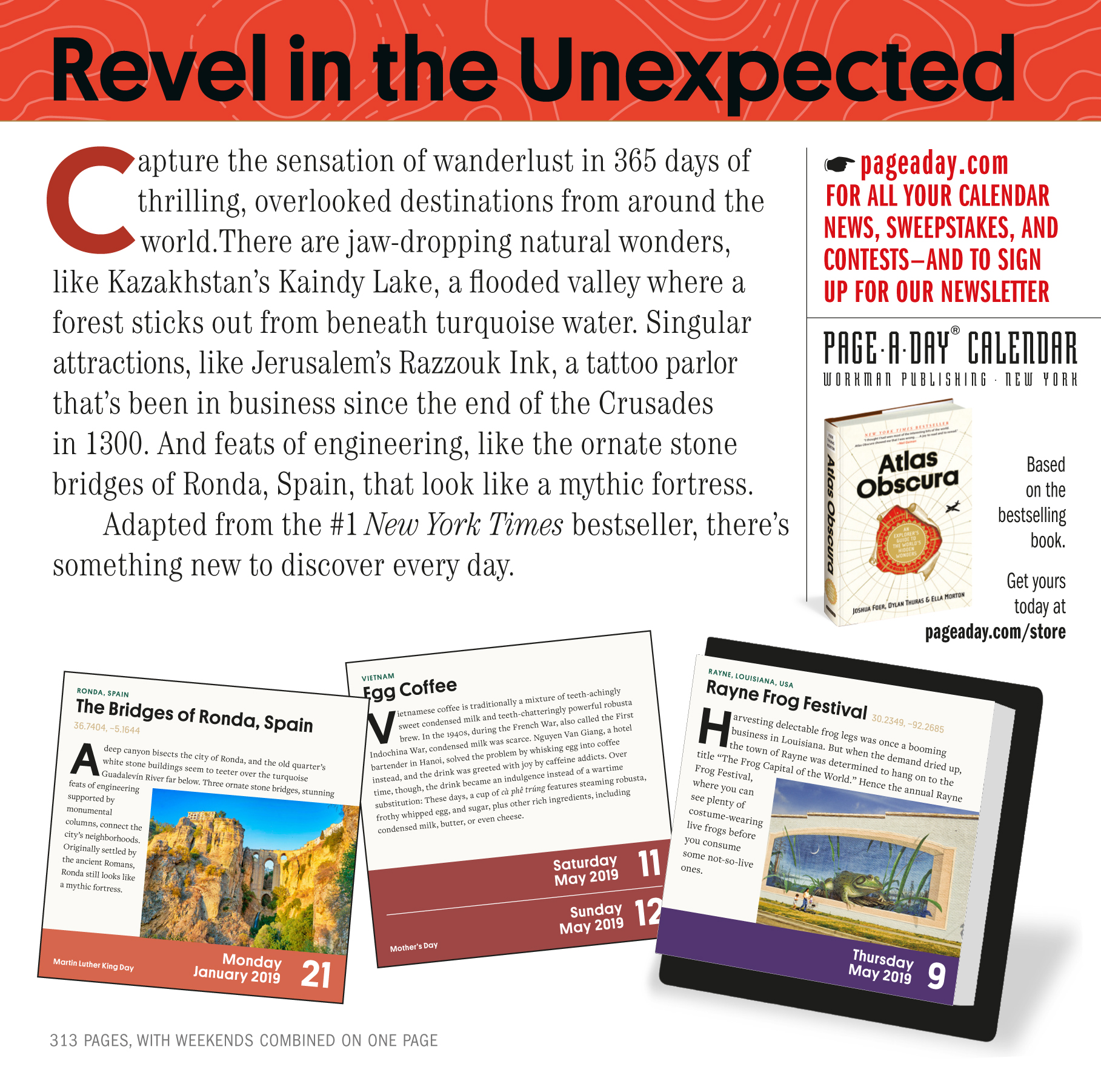 Adapted  from the #1 New York Times bestselling book—and from the founders of AtlasObscura.com, the beloved website—the ATLAS OBSCURA PAGE-A-DAY CALENDAR captures the sensation of wanderlust in 365 days of stunning color photographs, unique facts, and unexpected adventures. Jaw-dropping natural wonders, like the Great Blue Hole, a 984–by-407 foot indigo-hued sinkhole in Belize. Eccentric attractions, like the Snake Charmers Procession in Cocullo, Italy, a tradition that dates back to the 14th century. And singular locations, like Tashirojima, the Japanese island where cats outnumber people. An inspired gift for travelers, readers, and curious citizens of the world.