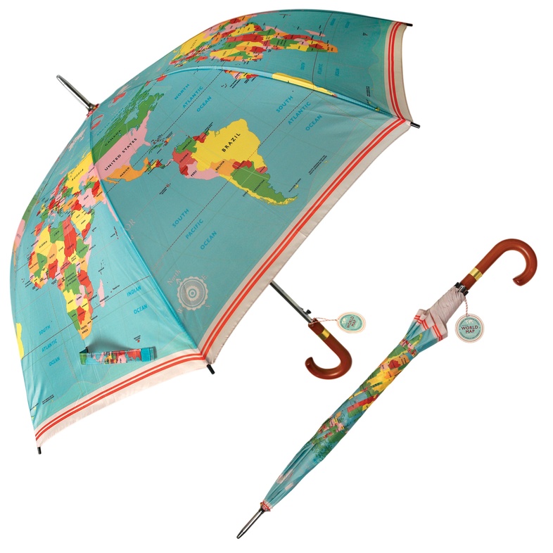 Mooie, grote paraplu met vintage wereldkaart. Met een druk op de knop veert de paraplu vanzelf open.
