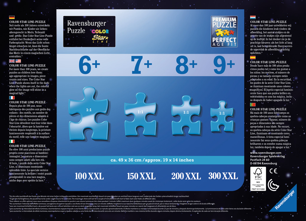 Ontsnap uit de realiteit en stap in de wereld van Ravensburger-puzzels. Tijdens het puzzelen ontdekken kinderen hun grootse vaardigheden. XXL-puzzels voor XXL-puzzelplezier. De XXL-grote puzzelstukken zijn eenvoudiger te leggen. Het resultaat is een kunstwerk op posterformaat dat in geen enkele kinderkamer misstaat. En deze starline puzzel geeft licht in het donker! Dankzij de met de hand gemaakte stansmessen is de vormvariatie van de stukjes oneindig. Kinderen vanaf 6 jaar zullen genieten van de Vrolijke dierenwereldkaart puzzel met 100 stukjes met als thema dieren.