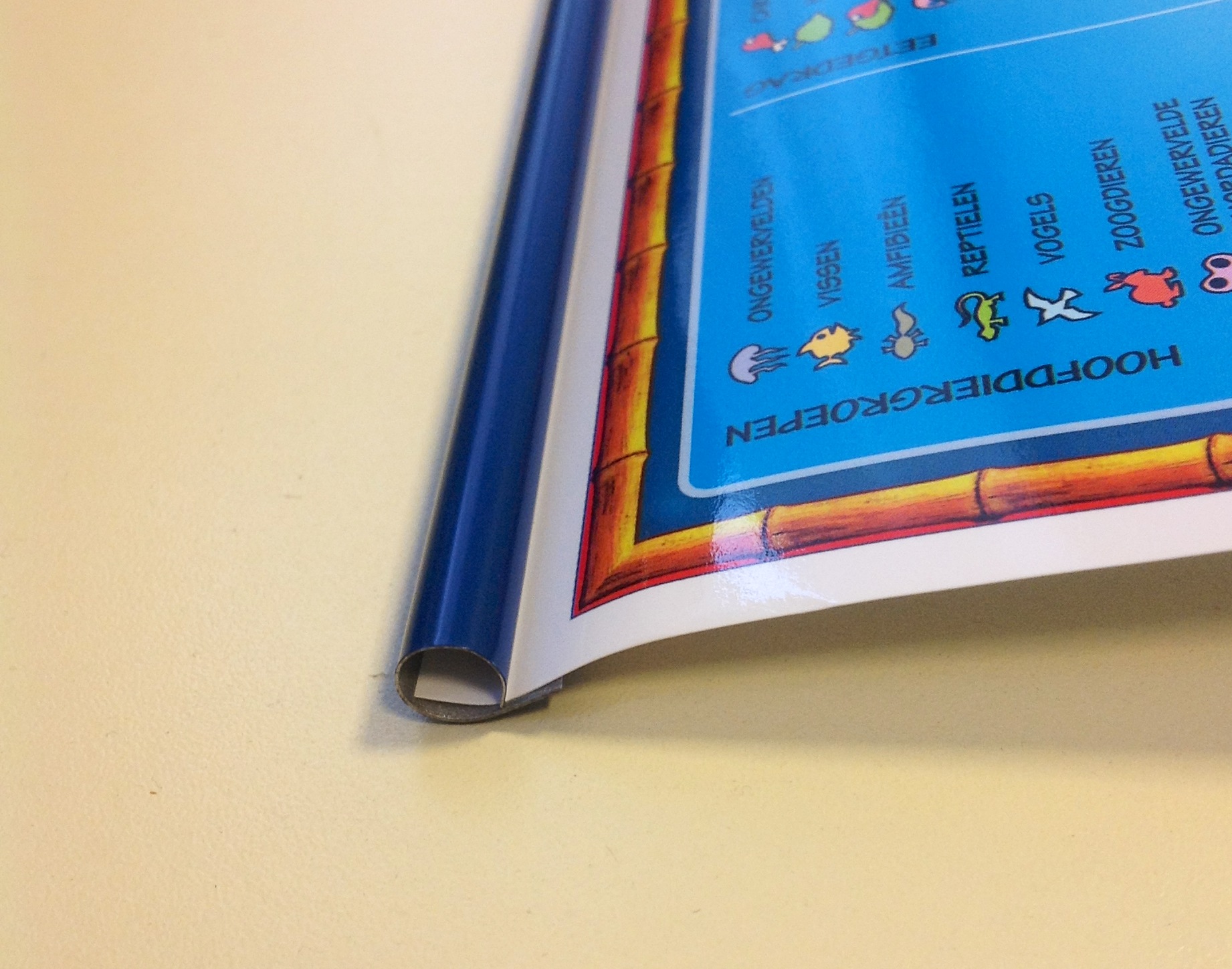 Geplastificeerd met blaauw metalen strips, makkelijk om op te hangen.