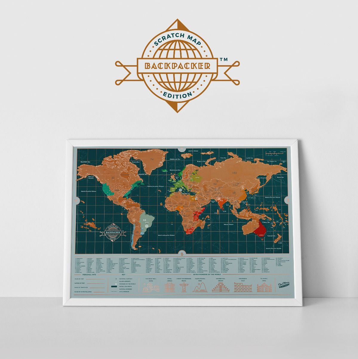Scratch Map™ Backpacker Edition is a detailed travel map with a top foil layer. Remove the foil as you travel to create a unique, personal record of where you’ve been. Printed on durable plastic, it’s writable, wipe-able and will stand up to the trials of travelling. The map features locations of the world’s capitals, major airports and even the seven wonders of the world. This is a must have for all travel enthusiasts whether you are going on a year long adventure or just another weekend away. This map can go the distance and is the perfect travel companion