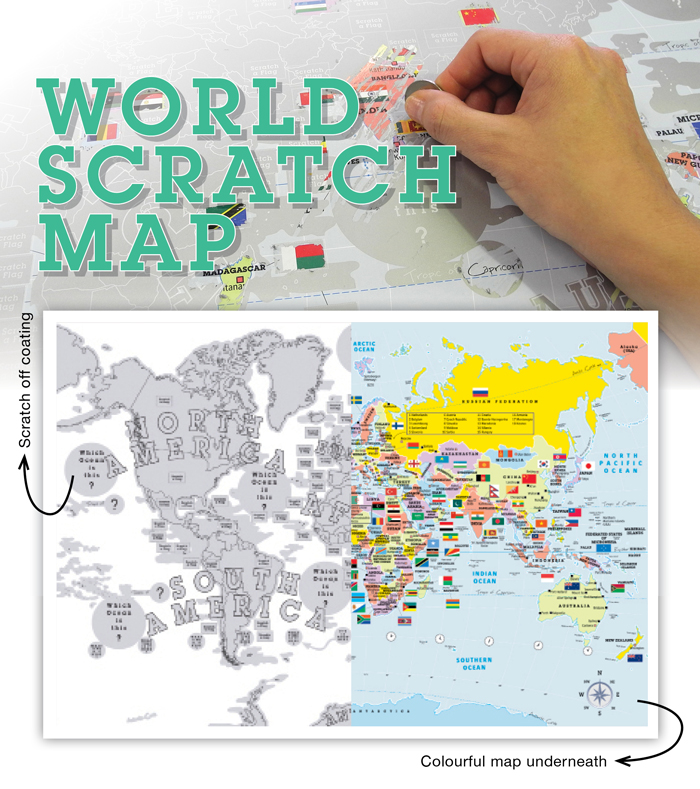 The World Scratch Map can also be used by those who enjoy travelling – scratch off the top coating to magically reveal the countries you have travelled to and keep a record of your trips.