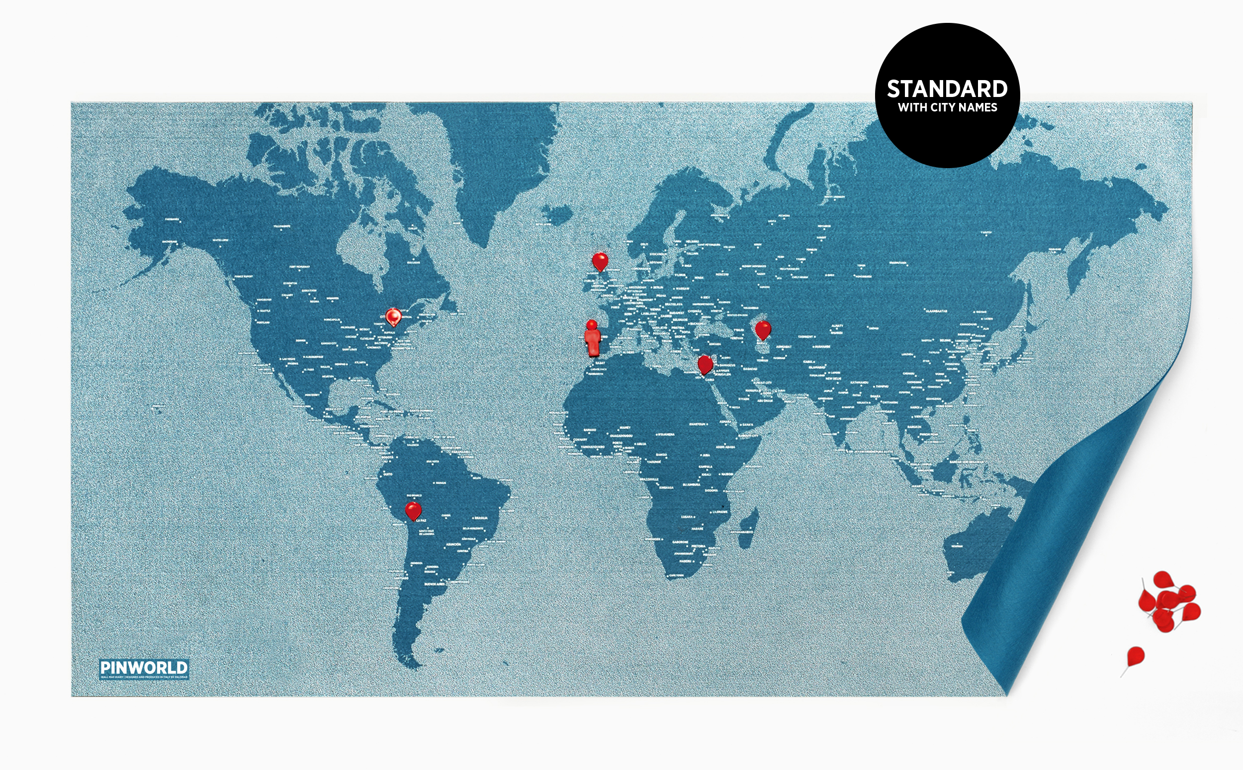 De PinWorld kaart is er in 2 kleuren (blauw en zwart) en 3 verschillende maten, de Small, Large en XL. De grootste versie, de XL, bestaat uit drie verschillende delen die je mooi naast elkaar kunt hangen.