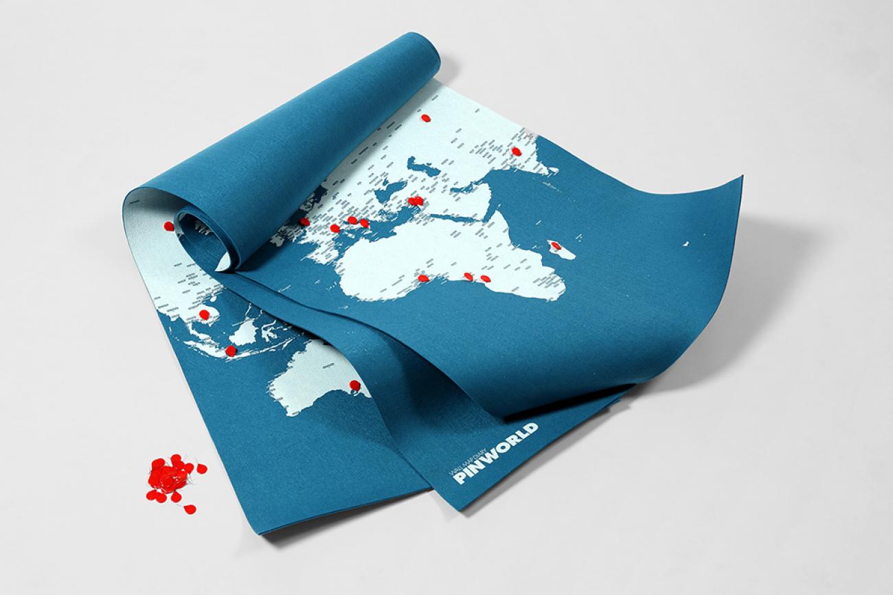 PinWorld is a world wall map printed on a flexible felt panel. The continents on the PIN WORLD wall maps, including the cities with over 1 million inhabitants, offer a unique and exciting view of a world without borders. The surprising graphic results achieved make the maps ideal for display at home or in the office. The tactile characteristics of felt transform the static nature of a map - a simple object to be looked at - into something new with which users can interact. The attractive package includes a set of 15 special pins - another original design by the creators of the project - to use with the map. Using these special pins it is possible to relate to the geographical image presented and develop an individual narrative concept. Pins, notes, drawings, photos and souvenirs can be attached to the maps to create a travel log of an actual trip or the expedition of your dreams. Thus you can create a “Wall map diary” making it possible to share your ‘adventures’ with friends and family.