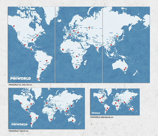 De PinWorld kaart is er in 2 kleuren (blauw en zwart) en 3 verschillende maten, de Small, Large en XL. De grootste versie, de XL, bestaat uit drie verschillende delen die je mooi naast elkaar kunt hangen.