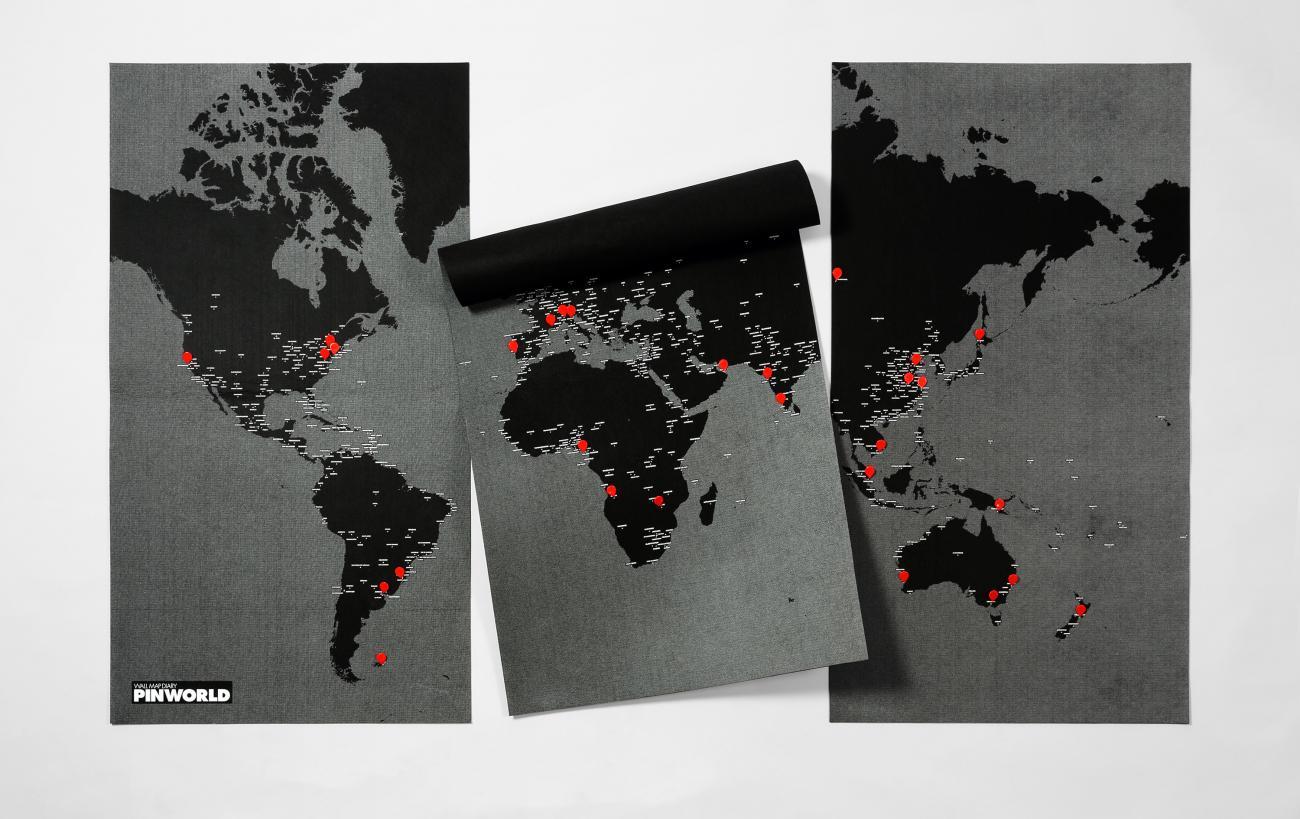 PinWorld is a world wall map printed on a flexible felt panel. The continents on the PIN WORLD wall maps, including the cities with over 1 million inhabitants, offer a unique and exciting view of a world without borders. The surprising graphic results achieved make the maps ideal for display at home or in the office. The tactile characteristics of felt transform the static nature of a map - a simple object to be looked at - into something new with which users can interact. The attractive package includes a set of 15 special pins - another original design by the creators of the project - to use with the map. Using these special pins it is possible to relate to the geographical image presented and develop an individual narrative concept. Pins, notes, drawings, photos and souvenirs can be attached to the maps to create a travel log of an actual trip or the expedition of your dreams. Thus you can create a “Wall map diary” making it possible to share your ‘adventures’ with friends and family.