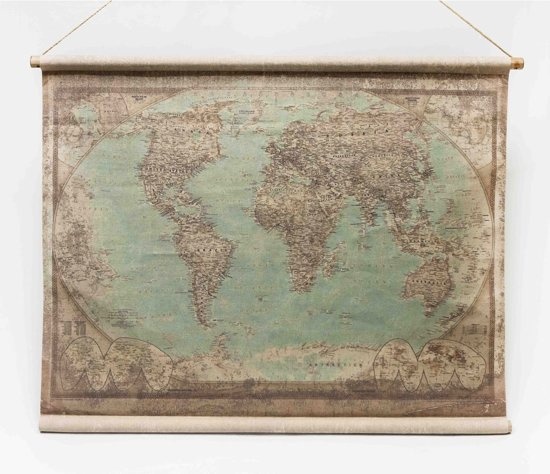 Vintage wereldkaart, formaat 100 x 75 cm, luxe uitgevoerd met houten stokken. Deze kaart is puur gemaakt als woonaccessoire - decoratie; het beeld is flets, doet oud (vintage aan) en niet altijd even goed leesbaar. De kaart is dan ook niet gemaakt als echte wereldkaart waarop je de landen eenvoudig en duidelijk kun opzoeken. Maar als je op zoek bent naar een bepaalde stijl van een oude gebruikte verweerde wereldkaart is dit jouw kaart!