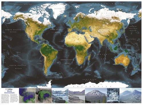 Includes national flags and key statistics for every country. World Environment Map: Satellite image of the world with physical names. Also includes fascinating images of environmental change affecting the planet.