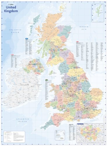 United Kingdom Map: Detailed politically coloured road map of all of the United Kingdom. Statistics and flags shown for each of the home countries.