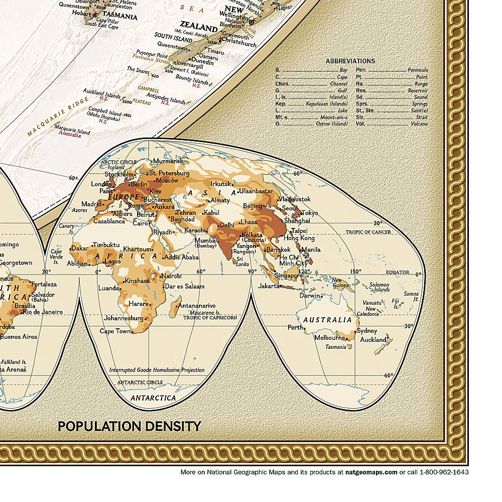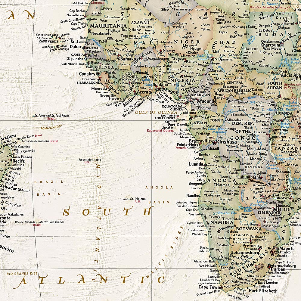 A current political map that features our world in rich, earth-toned colors. Astounding detail and boardroom quality make this map excellent for reference in your home or office. Features the Winkel Tripel projection to reduce distortion of land masses as they near the poles