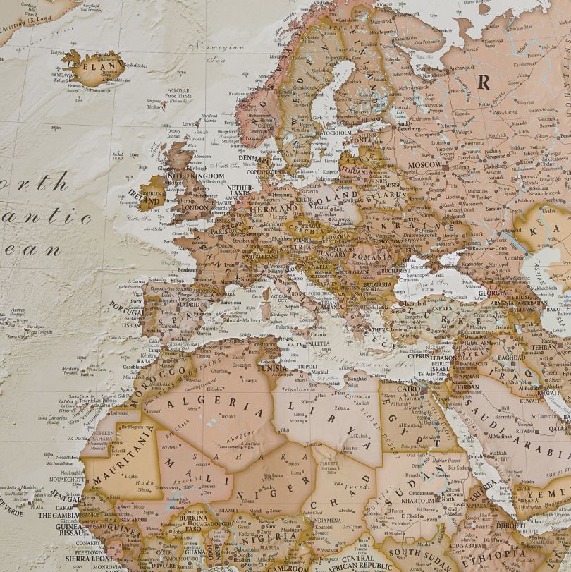 Political wall map of the world from Maps International, size 136 x 84cm, in an antique-style presentation: countries in hues of brown, beige and tan with their borders outlined in a stronger colour - oceans in light grey, with graphic relief for the ocean floor and names in italics adding to the overall elegant, old-fashioned feel.