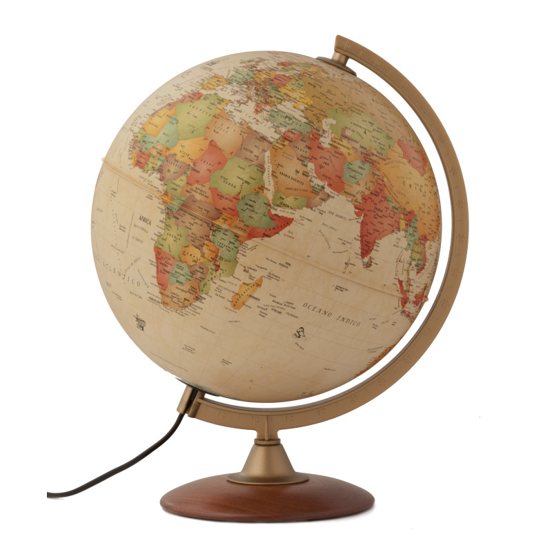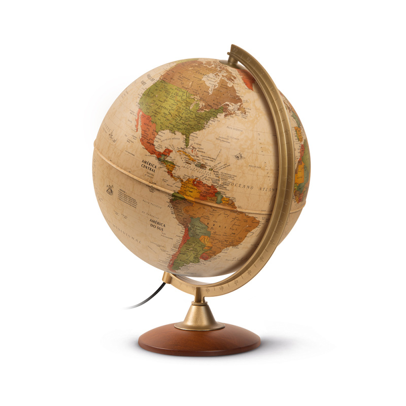 Met deze Nova Rico wereldbol haalt u een prachtige geografische globe met verlichting in huis. De kaart gebruikt op de bol is up-to-date en laat het huidige beeld van de wereld zien. De voet is van massief hout en heeft een walnoothouten kleur, de kunststof meridiaan heeft een koperkleur.