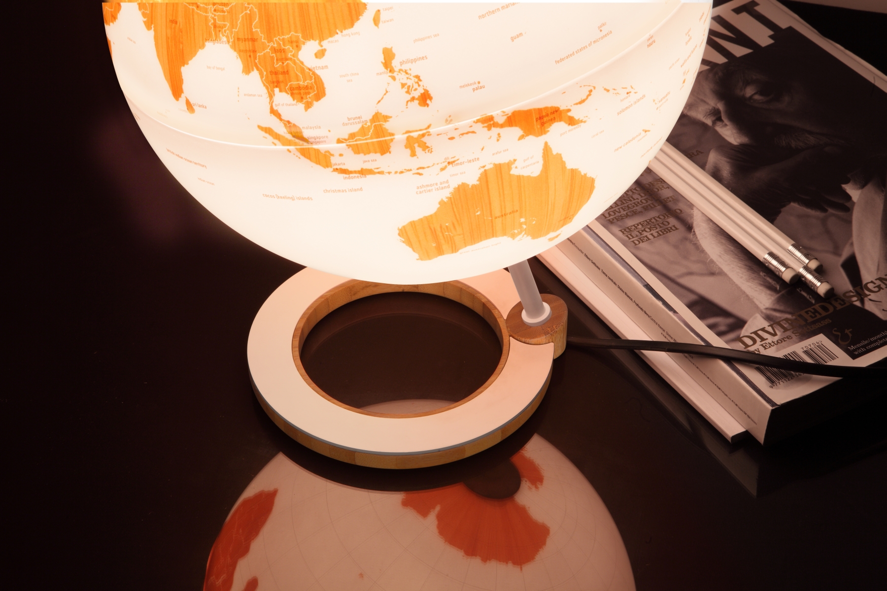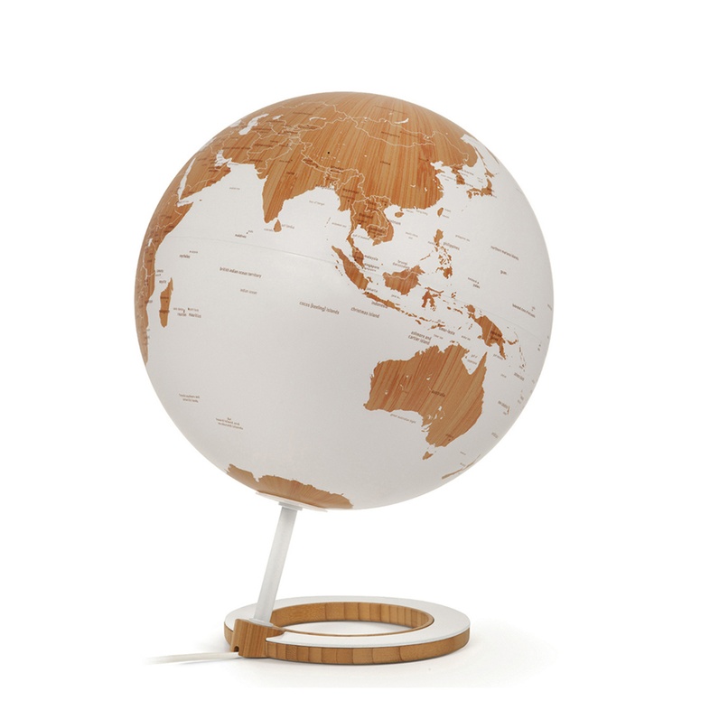 Prachtige milieuvriendelijke globe met verlichting, waar bamboe in is verwerkt in plaats van hout. De voet is van bamboe en de bol een combinatie van kunststof en bamboe. Kleur van de oceaan is wit, waardoor er een sfeervol licht ontstaat. Materiaal meridiaan: metaal.