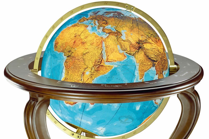 Dieser Globus zeichnet sich durch seine mundgeblasene Kristallglaskugel sowie Perlmutt-Intarsien in altdeutschen Nussbaum-Gestühl aus. Weltweit gibt es nur wenige Glashütten, die in der Lage sind, Kristallglaskugeln mit einem Durchmesser von 51 cm zu blasen. Der DUO-Leuchtglobus ist der König unter den Globen. Demnach ist sein Kartenbild entsprechend aufwendig gestaltet. Erst nach 24 Druckvorgängen erhält das DUO-Kartenbild sein charakteristisches Aussehen. Brillanz der Farben in beleuchtetem Zustand und Farbharmonie des politischen Kartenbilds werden durch eine unübertroffene Fülle an Informationen ergänzt. Beleuchtet sehen Sie das physische Kartenbild, unbeleuchtet das politische Kartenbild.