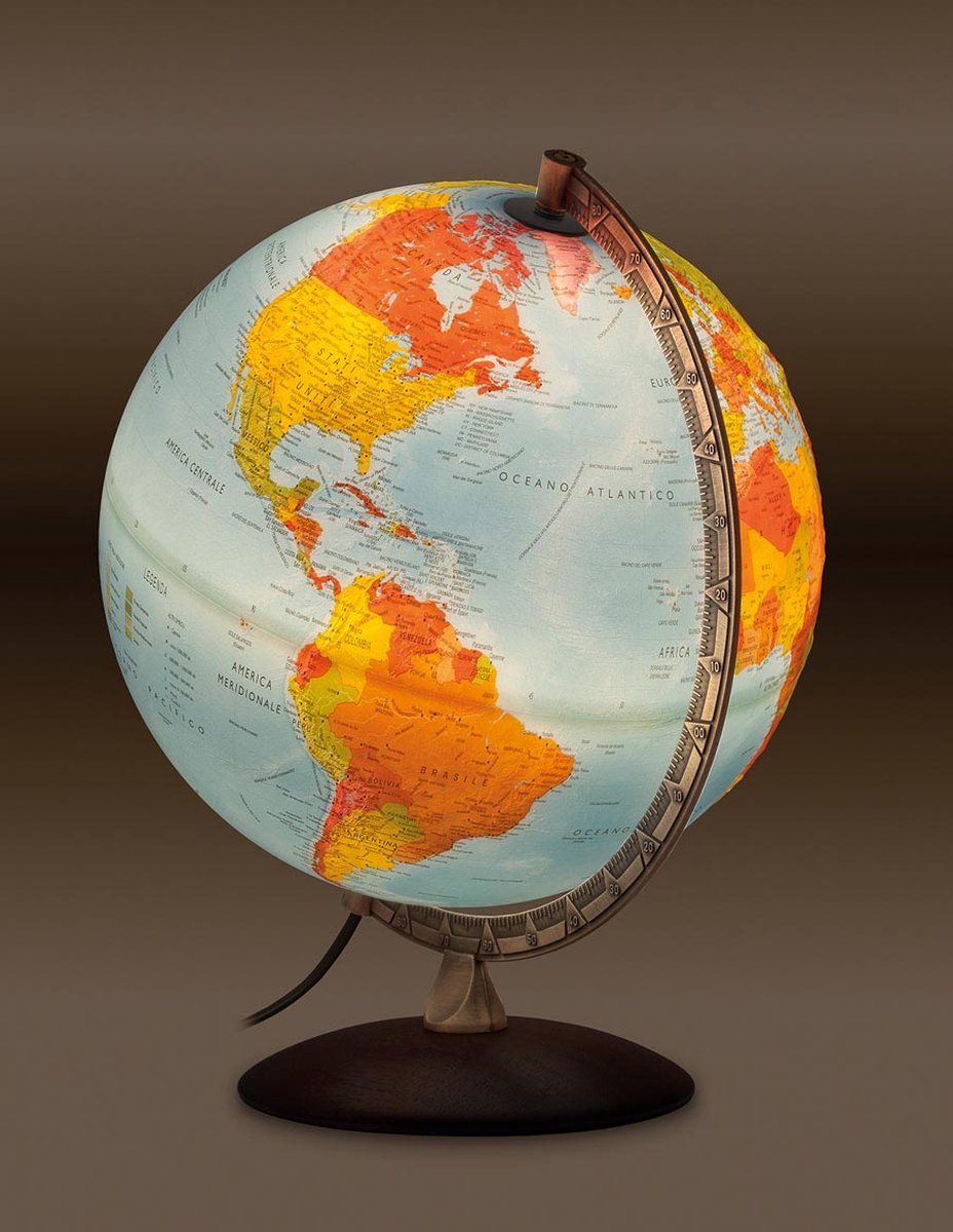 De wereldbol is zonder verlichting in een natuurkundige uitvoering. Als je het lampje aandoet, krijgen de verschillende landen aparte kleuren. Het kaartbeeld is up-to-dat en laat het huidige wereldbeeld zien.