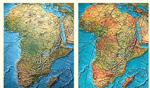 The ground-vegetation map (switched off) shows the earth's surface with the rock-mountains, the forests, the cultivated zones, the savannas, the deserts and in white the polar areas or the glaciers. The relief impression of the mountains and sea-beds are really astonishing.