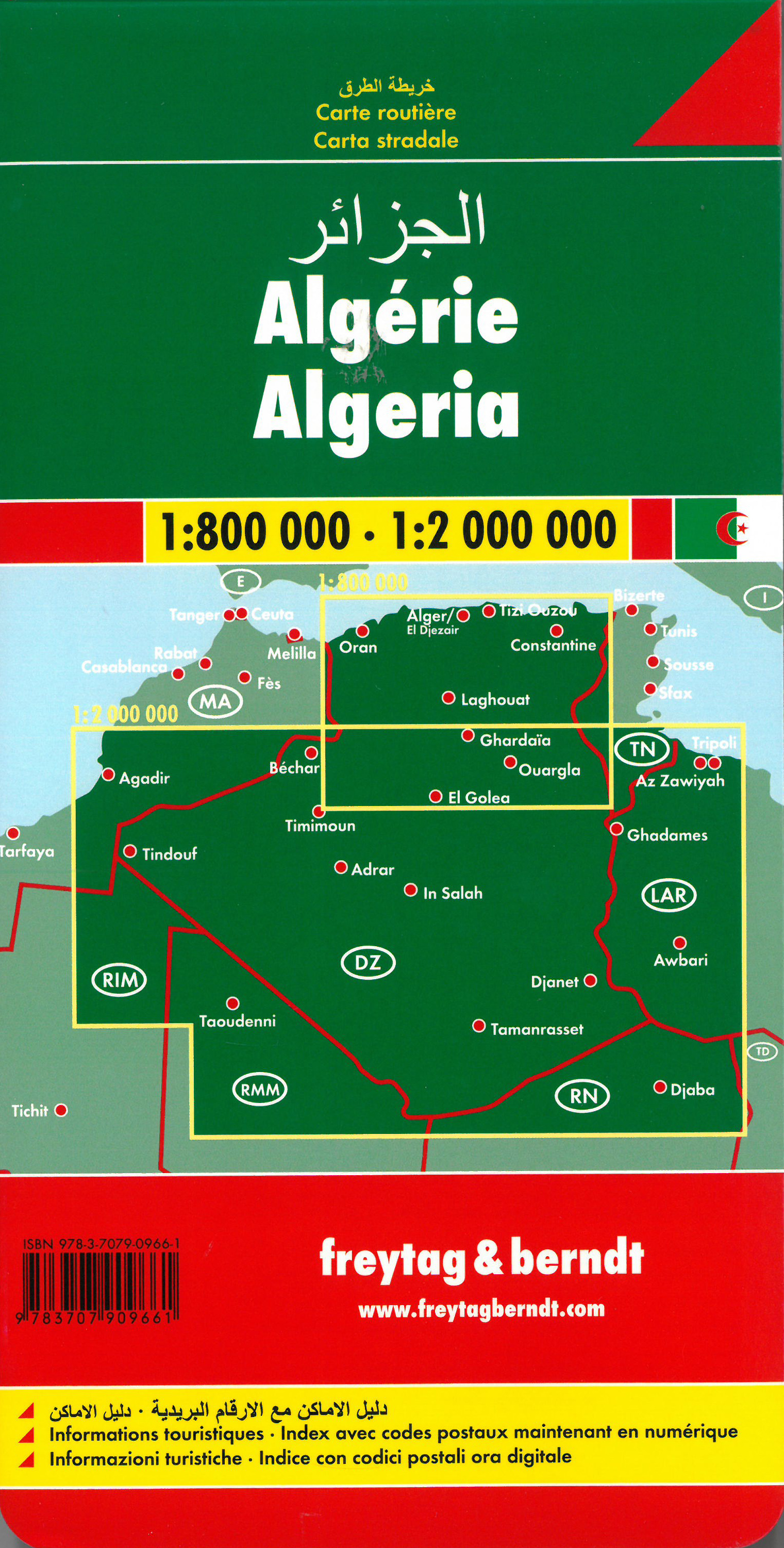 De wegenkaarten van Freytag & Berndt zijn verkrijgbaar voor talrijke landen en regio's over de hele wereld. Naast het overzichtelijke ontwerp bevat de wegenkaart "Algerije 1:800 000" talrijke aanvullende informatie, zoals de toestand van de wegen, toeristische bezienswaardigheden, campings en diverse plattegronden van stadscentra. Het complete plaatsnamenregister maakt het bovendien mogelijk om snel de weg te vinden. Toeristische informatie; plaatsnamenregister met postcodes nu ook digitaal beschikbaar Nu met digitaal register: bekijk alle informatie snel en eenvoudig op uw mobiele telefoon!
