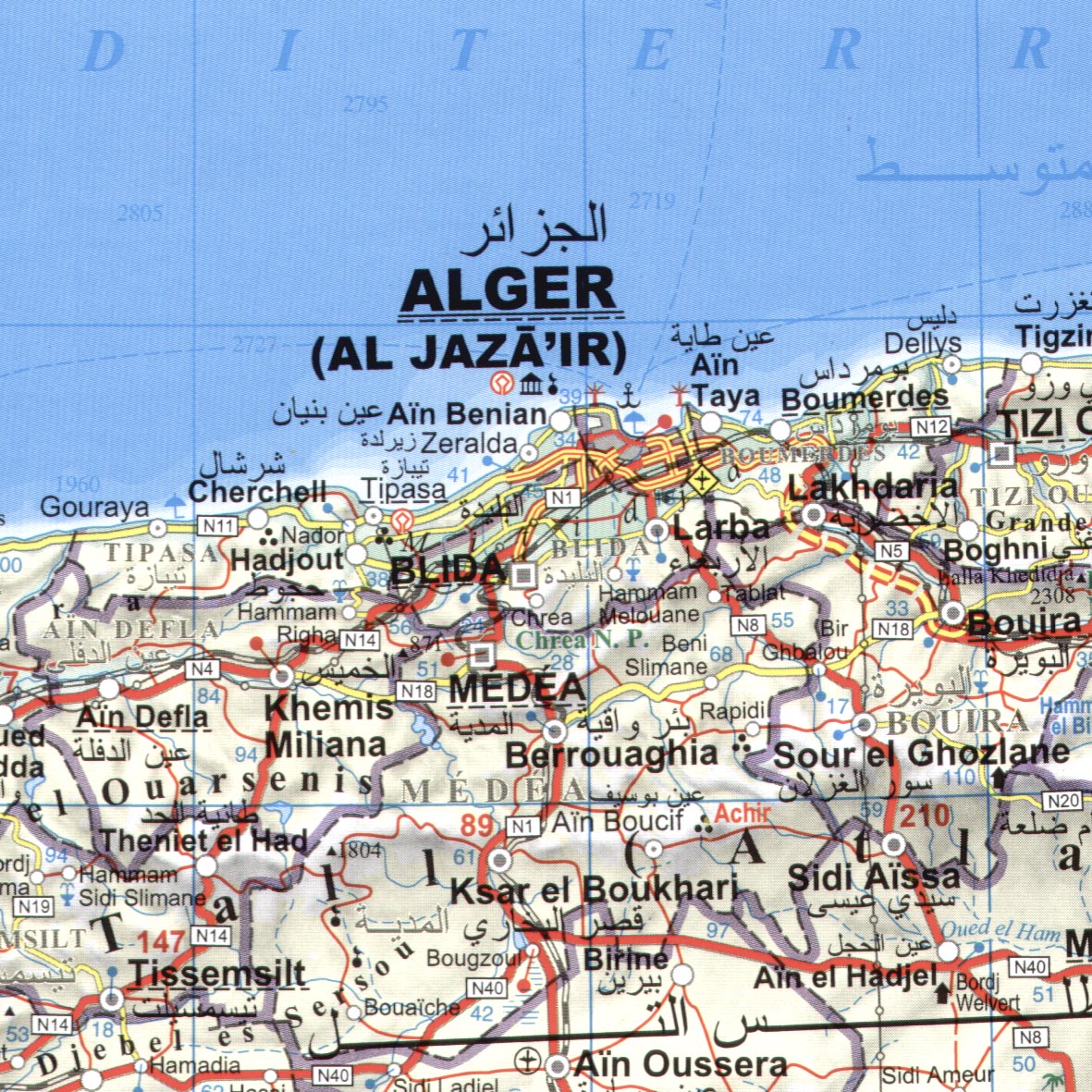 Mooie, duidelijke kaart van Algerije met plaatsnaamaanduiding in het Engels en het Arabisch.
