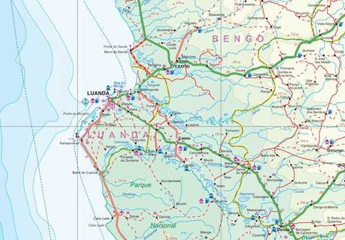Wegenkaart AngolaAngola with a large, clear street plan of central Luanda. Altitude colouring shows the country’s topography, with additional spot heights. Swamps, salt pans and desert areas are marked.