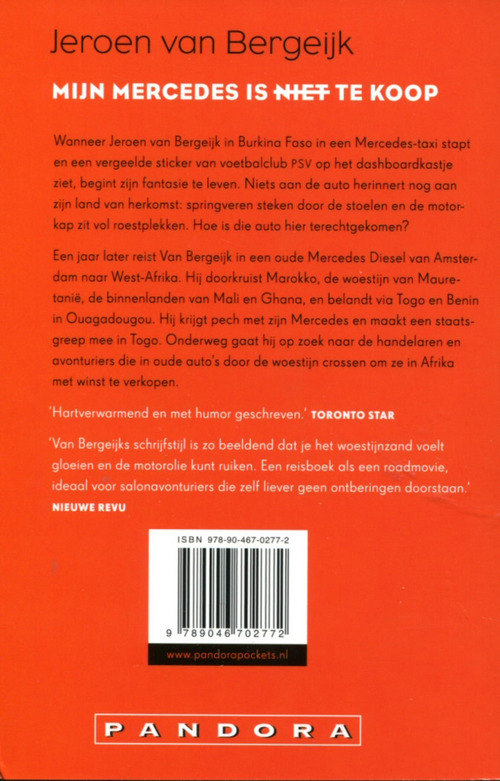 Wanneer Jeroen van Bergeijk in Burkina Faso in een Mercedes-taxi stapt en een vergeelde sticker van voetbalclub PSV op het dashboardkastje ziet, begint zijn fantasie te leven. Niets aan de auto herinnert nog aan zijn land van herkomst: springveren steken door de stoelen en de motorkap zit vol roestplekken. Hoe is die auto hier terechtgekomen? Een jaar later reist Van Bergeijk in een oude Mercedes Diesel van Amsterdam naar West-Afrika. Hij doorkruist Marokko, de woestijn van Mauretanië, de binnenlanden van Mali en Ghana, en belandt via Togo en Benin in Ouagadougou. Hij krijgt pech met zijn Mercedes en maakt een staatsgreep mee in Togo. Onderweg gaat hij op zoek naar de handelaren en avonturiers die in oude auto's door de woestijn crossen om ze in Afrika met winst te verkopen. 'Hartverwarmend en met humor geschreven.' Toronto Star