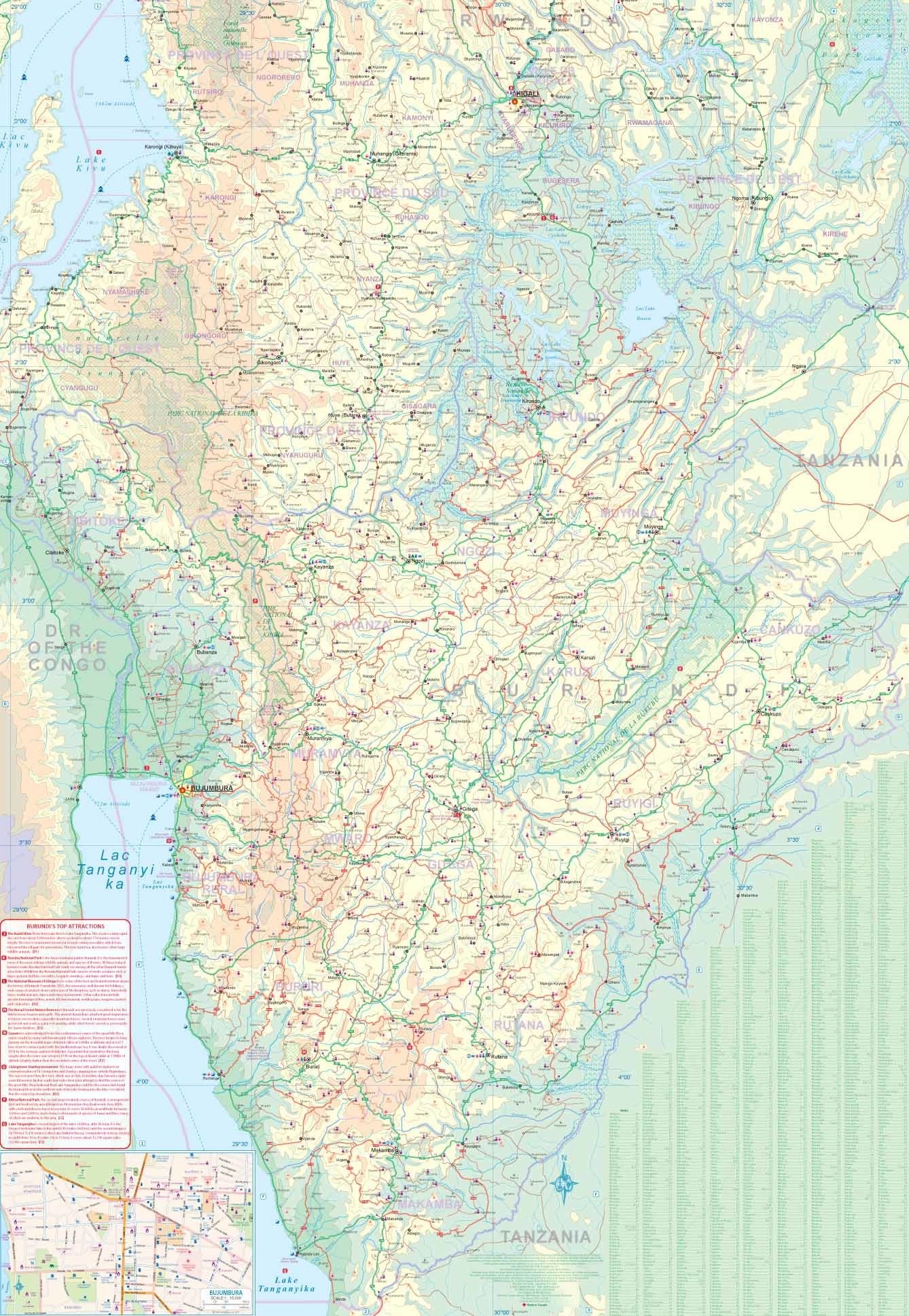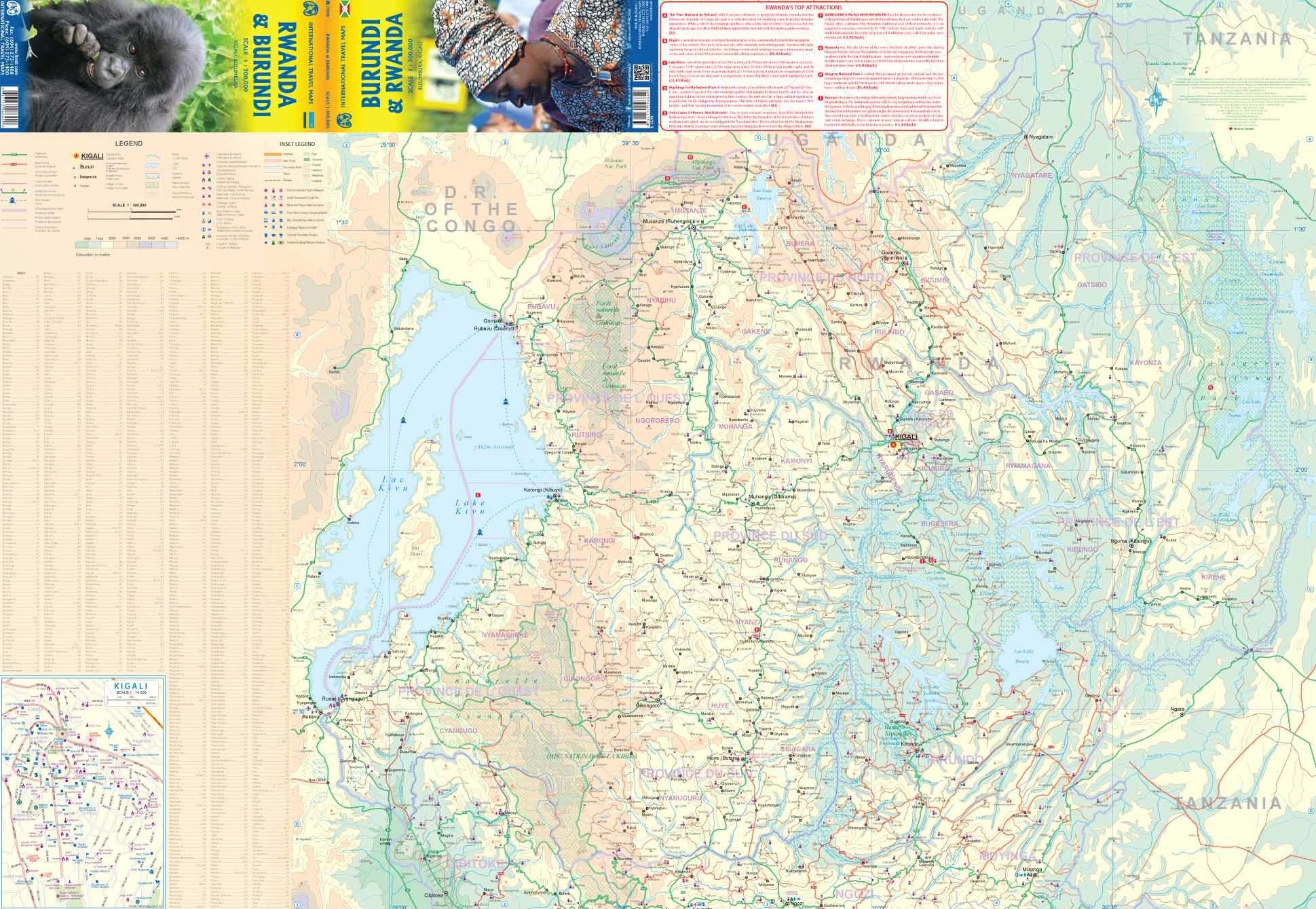Een degelijke landkaart van Rwanda & Burundi met aanduidingen van o.a. nationale parken, vliegveld, benzinepomp, dirt-roads en kleine plattegrond van hoofdstad. Als overzichtskaart goed te gebruiken.