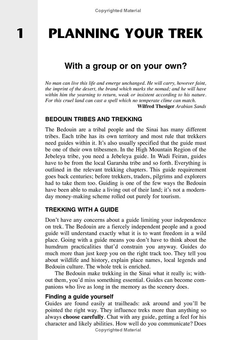 Ik heb met een kleine groep mensen met kamelen (eigenlijk dromedarissen) onder begeleiding van bedouïnen een georganiseerde 5-daagse trektocht door de Sinaï gemaakt. Deze gids is voor zo'n trektocht een uitstekende voorbereiding. Het tamelijk dikke boek bevat een uitgebreide beschrijving van alles wat je zou moeten weten, wat je kunt tegenkomen en hoe hiermee om te gaan. De 2e helft van de gids wordt gevormd door gedetailleerde beschrijvingen van wandelroutes voorzien van keurige kaartjes en waypoints. Het is geschreven in prettig leesbaar Engels door een van oorsprong geograaf. De beschrijving van dit boek op deze website is accuraat.