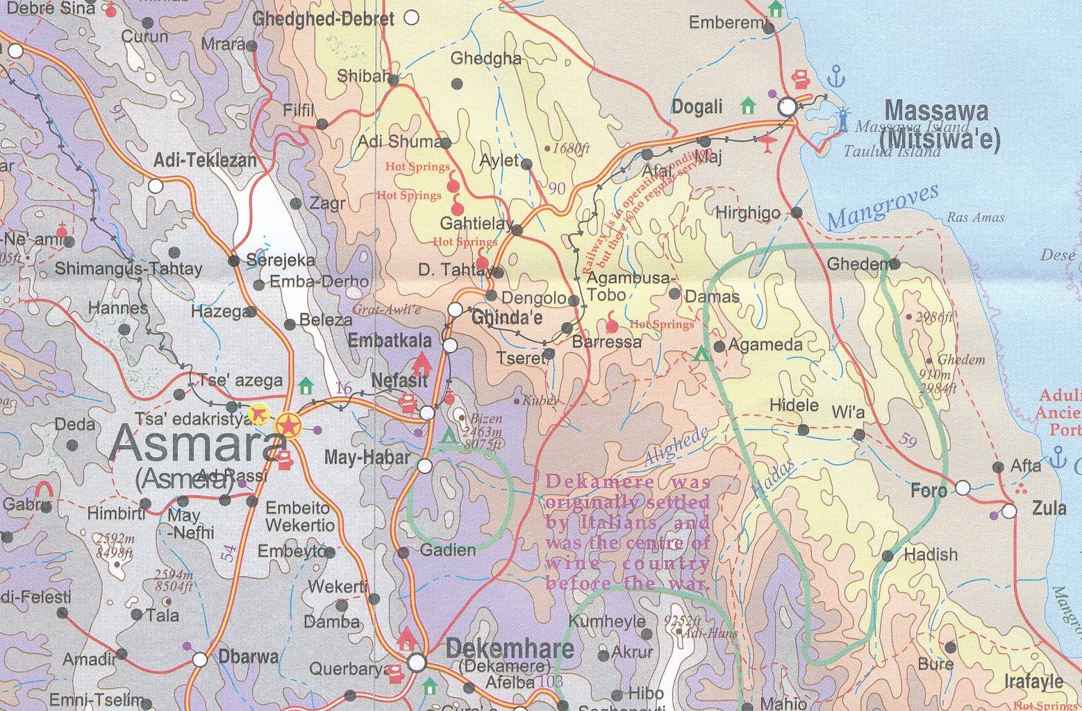 An inset with a street plan of Asmara names the main streets in the city and hightlights places of imterest. Another inset presents the country's annual rainfall. Extensive text describes the country's history and geography.