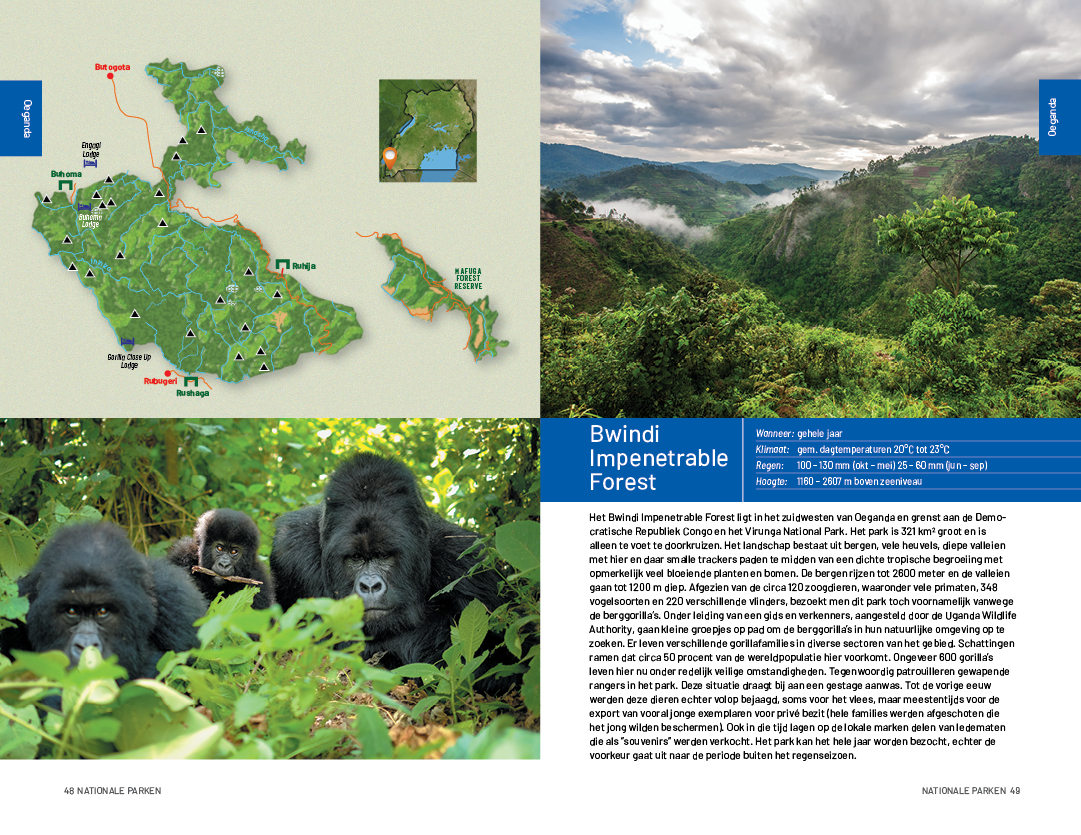 Een safari in Oost-Afrika is niet alleen een kennismaking met de Afrikaanse fauna en flora. Het is ook een ontmoeting met volkeren die vaak nog onder authentieke omstandigheden hun culturele gewoontes hebben behouden. Onderweg naar de nationale parken, bezoekt u dorpen waar de bewoners veel waarde hechten aan hun eeuwenoude tradities. Voorbeelden die u direct opvallen zijn de kleding, bouwstijlen en nijverheid. Ook de nationale parken kennen een grote verscheidenheid. Sommige landschappen staan onder invloed van een groot meer of rivieren en er zijn de droge uitgestrekte savannen als resultaat van matige neerslag. Er zijn spectaculaire decors als gevolg van oeroude vulkaanerupties en hooggebergten waarin diersoorten volledig zijn aangepast aan hun omgeving. Als u wilt weten welk dier u voor de lens heeft, mag dit boek niet aan uw bagage ontbreken.