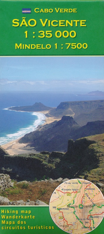 Topografische wandelkaart voor de Kaapverdische Eilanden São Vicente en Mindelo. Met hoogtelijnenafstand van 50 meter. Legenda en tekst in het Duits, Engels, Italiaans en Portugees. Met stranden en duikplaatsen.