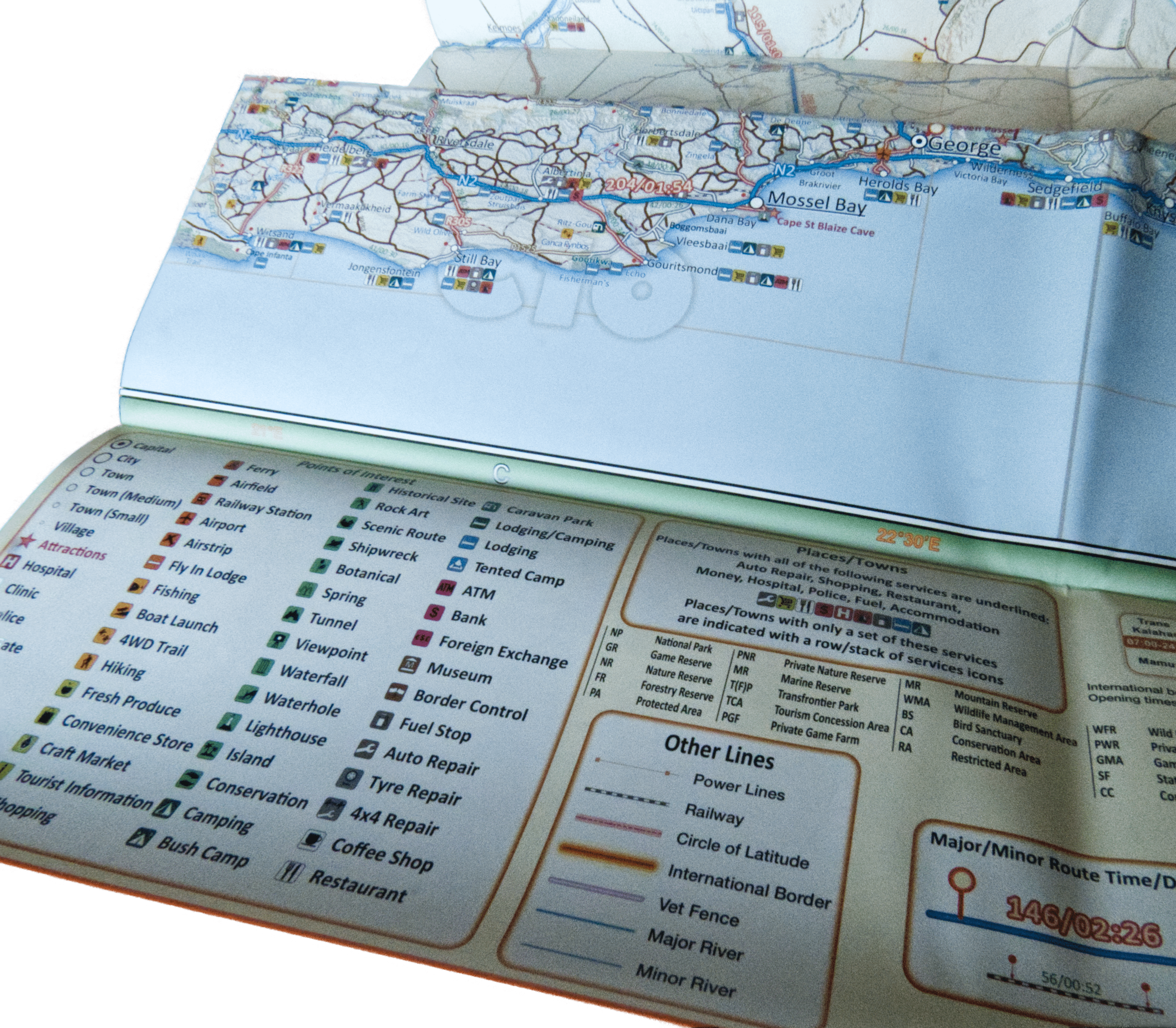 De eerste toeristische kaart van Zuid-Afrika die reistijden en afstanden vermeld. De kaart heeft een schaal van 1:1.000.000 en biedt gedetailleerde informatie over alle toeristische bestemmingen van Zuid-Afrika, zowel populaire als onbekende.