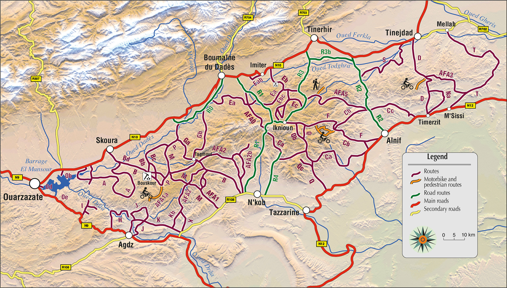 Jacques Gandini and Hoceine Ahalfi have explored in detail the jebel Sagho, this magnificent wild region of southern Morocco, with its breathtaking landscapes, situated to the east of Warzazat and to the south of the Dades valley, and have put together 59 itineraries totalling 2,500 kilometres and 1,100 waypoints.