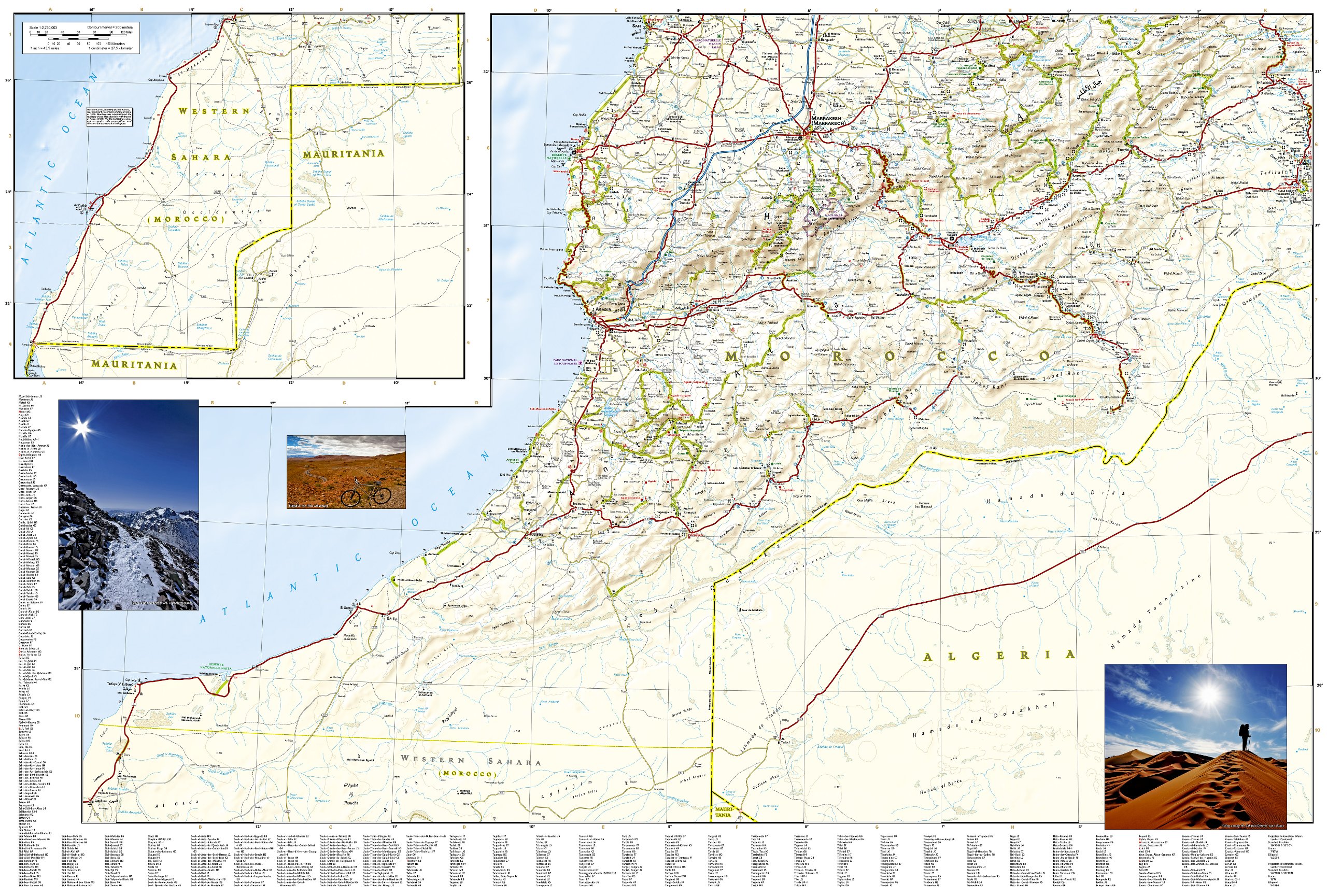 Wegenkaart van Marokko met vermelding van veel bezienswaardigheden, nationale parken en attrakties. Watervast en scheurvast. Juist door deze vermeldingen onderscheidt de kaart zich van andere wegenkaarten.