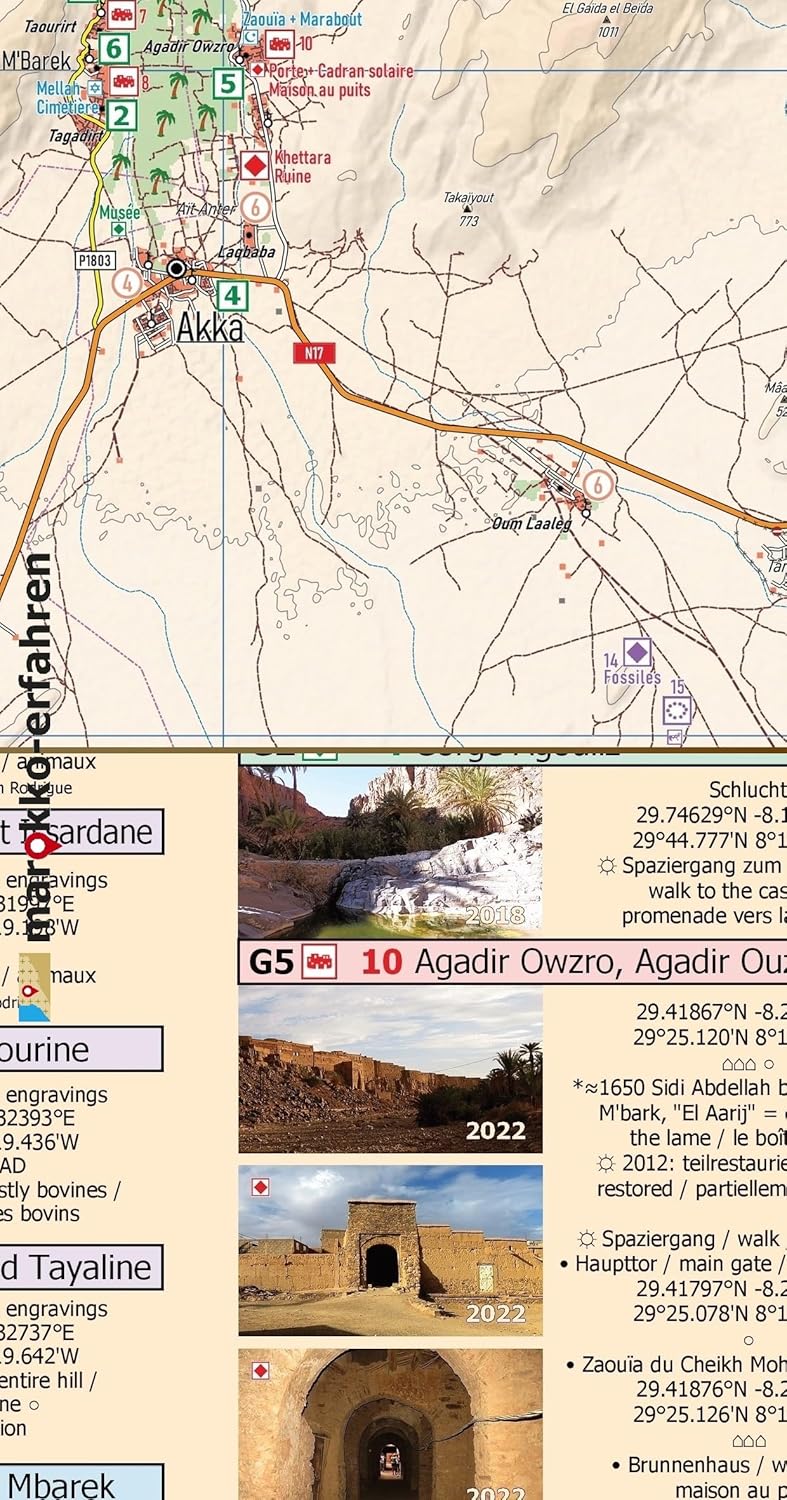 Drietalige (Duits/Engels/Frans) uiterst gedetailleerde toeristische kaart/reisgids van Marokko met meer dan 160 bestemmingen + 88 daarvan met coördinaten + achtergrondinformatie over geschiedenis, bezienswaardigheden en andere bijzonderheden - Tata- en Akka-oases aan de N17 - met de gereconstrueerde minaret van Agadir Amghar - kleine zeldzame grotschildering - Zonnewijzers en waterklokken in Tadakoust, Agadir l’Henna en Agadir Owzro, ook wel Agadir Ouzrou genoemd - pre-islamitische monumenten in antenne- en halvemaanvorm (“croissant”) - Sporen van Khettara's - talrijke rotsgraveervelden nabij Oum Laaleg en tussen Akka en de N7 - Karst Imitek - bovengrondse landvormen - Zaouïas, moskeeën en Joodse begraafplaatsen - Stations van Charles de Foucauld tijdens zijn wandeling van Tissint naar Mogador (Essaouira) - Wekelijkse marktdagen (souks) Vee graast op weelderige groene velden tussen antilopen en gazellen. Zo nu en dan nadert er een olifant of zelfs een leeuw - zo zag het gebied langs de rivieren Assa en Akka tussen Jbel Bani en Oued Drâa er duizenden jaren geleden uit. In de sporen van deze tijd waan je je momenteel in deze tijd. Traditioneel ontwikkelde systemen voor eerlijke irrigatie in oases kunnen vandaag de dag nog steeds van dichtbij worden ervaren en illustreren op indrukwekkende wijze het belang van water. De biografie van rabbijn Abi Serur Mordechai, geboren in Akka, is nauw verbonden met de onderzoeksreis van Charles de Foucauld, wiens wandeling op talloze genoemde punten kan worden gevolgd. Tussen Anti-Atlas en Jbel Bani groeit de woestijnroos, de echte roos van Jericho, onopvallend tussen de stenen, en wordt de overlevingsstrategie ervan beschreven.Reviews