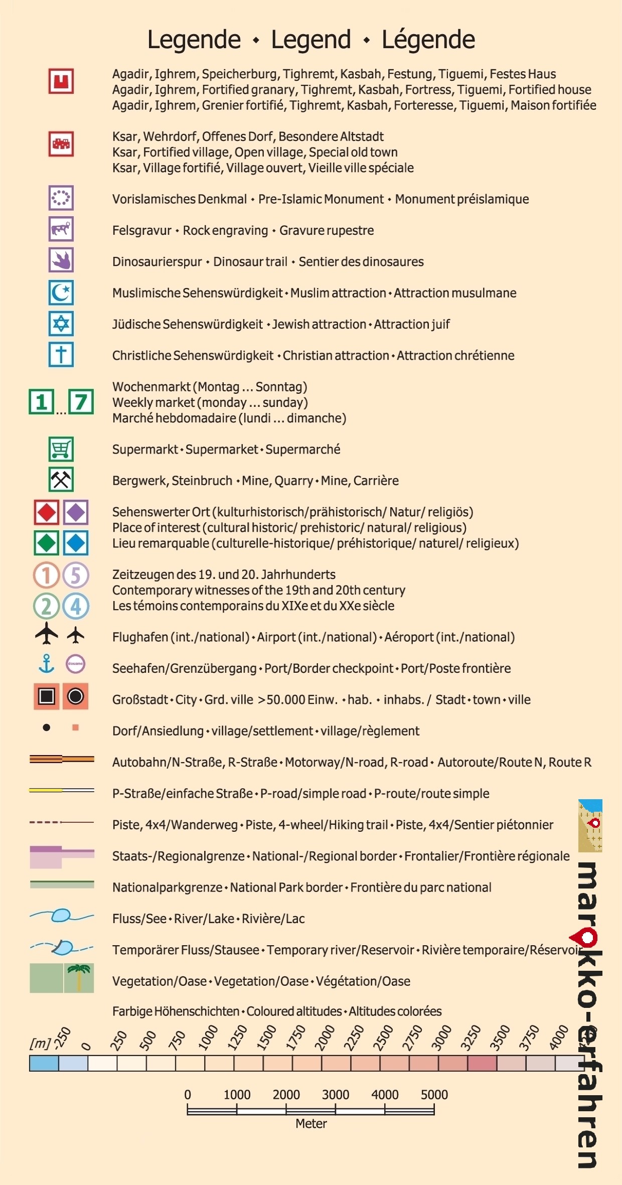 Drietalige (de. / en. / fr.) zeer gedetailleerde toeristische kaart / reisgids van Marokko.